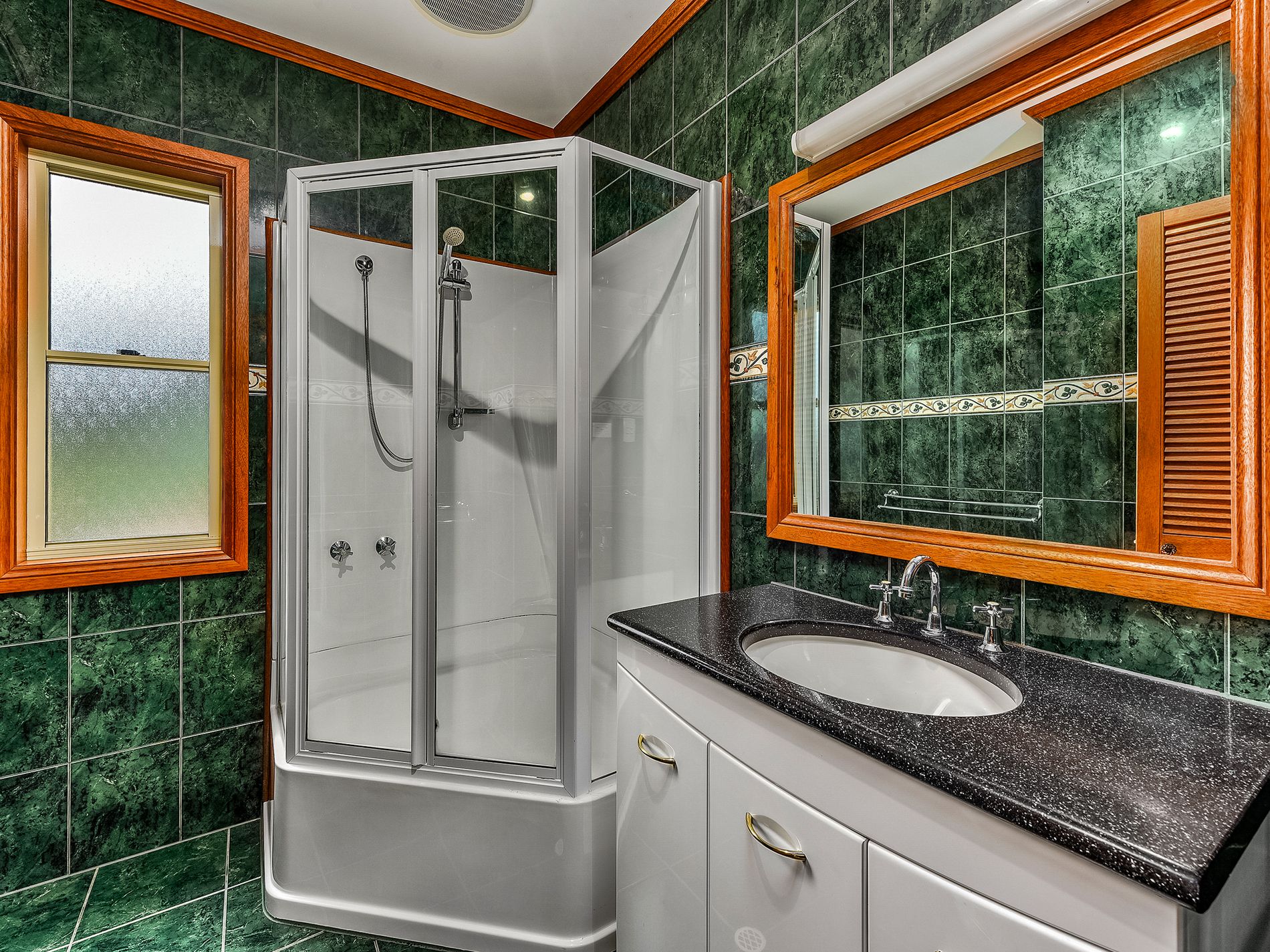 The main bathroom includes wall to floor tiles corner shower unit and large vanity. Lastly for the bottom level is the rear access door and laundry large with toilet.