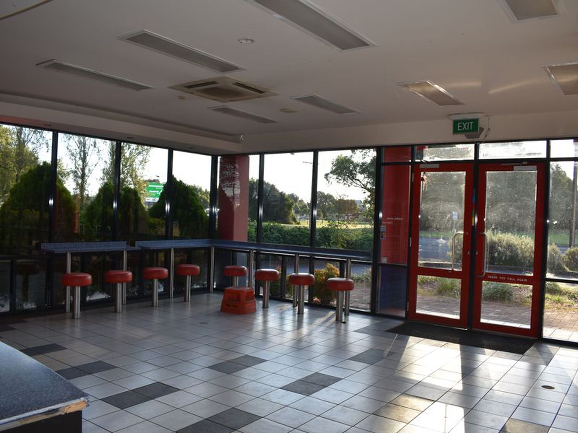 Indoor and outdoor dining with glass wind protection. fixed stools with window views. Fixed service counter and customer restrooms