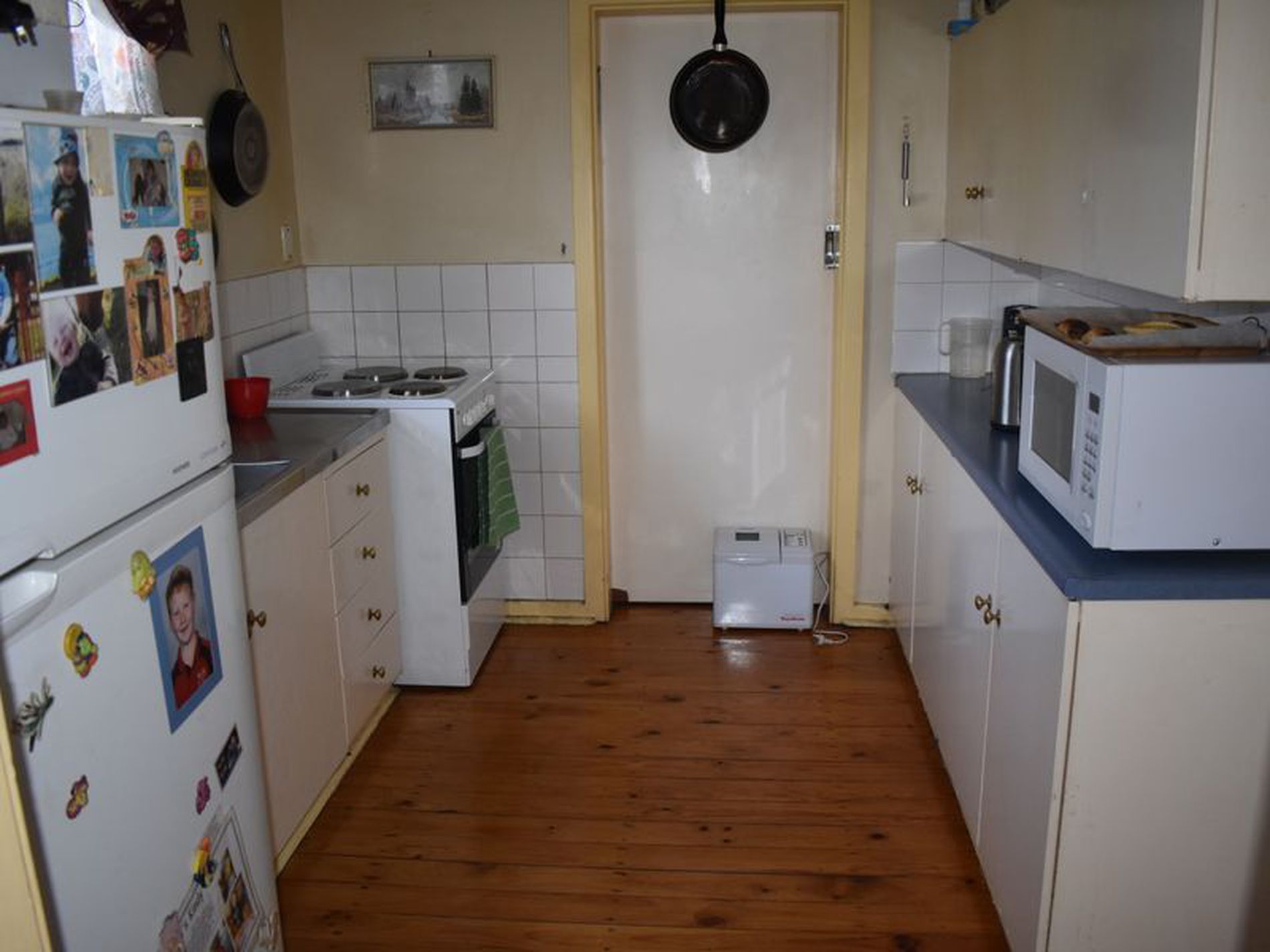 - Kitchen with timber floor and electric cooking.