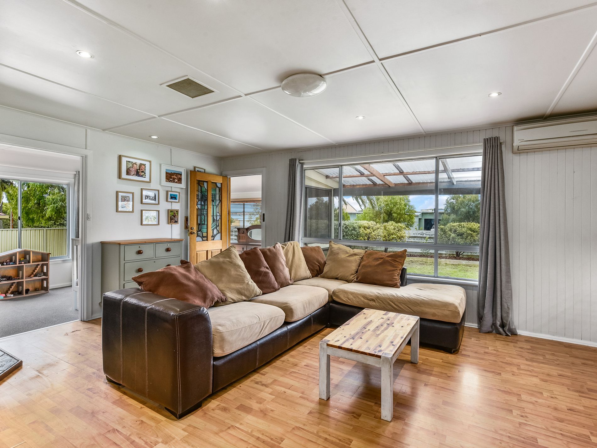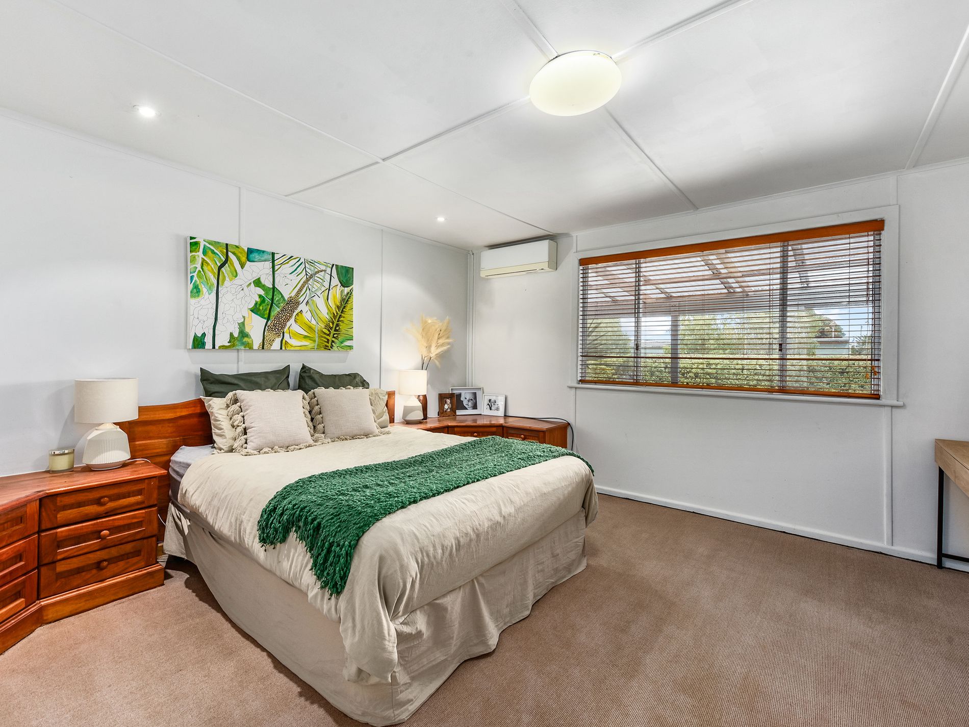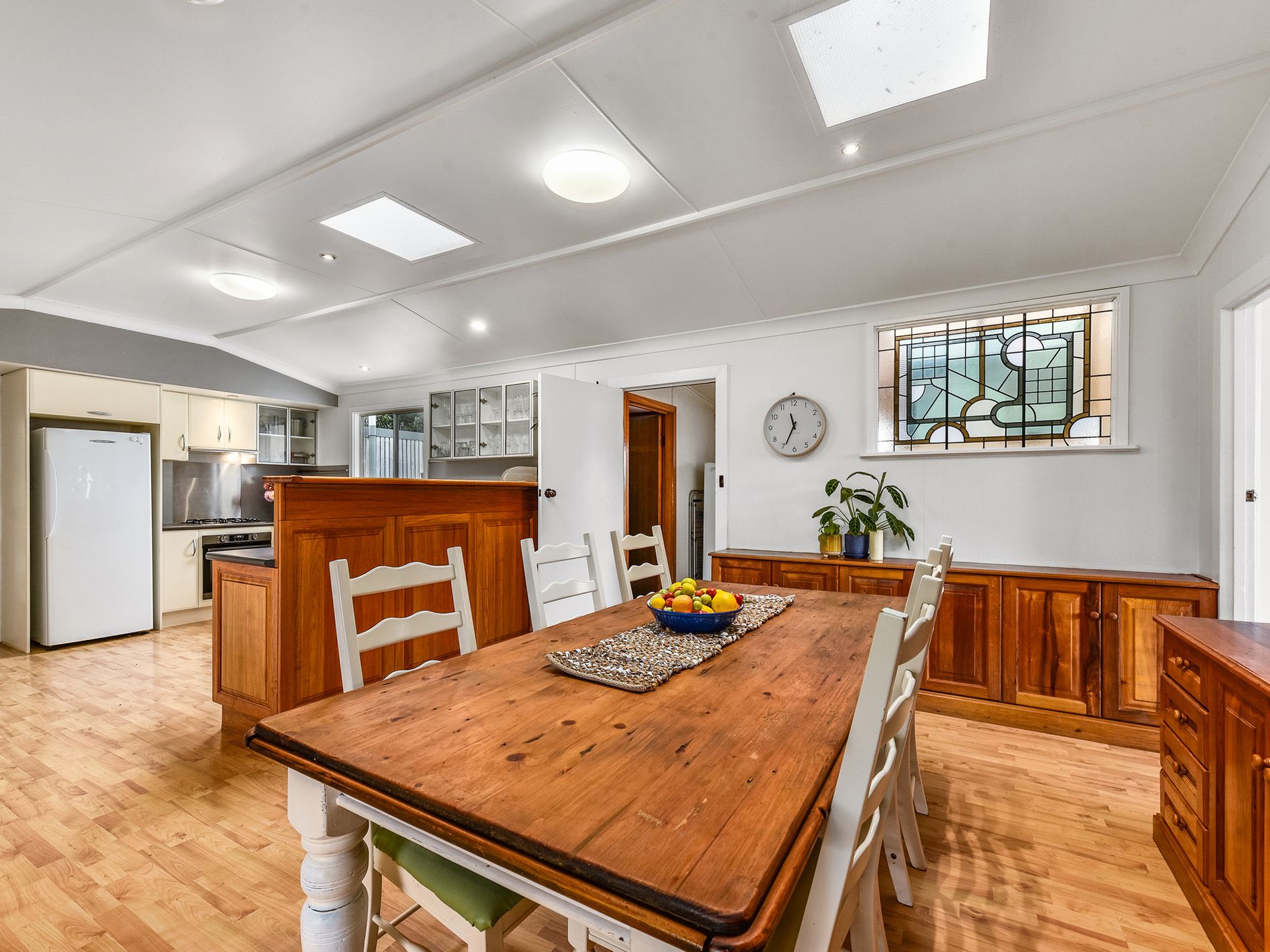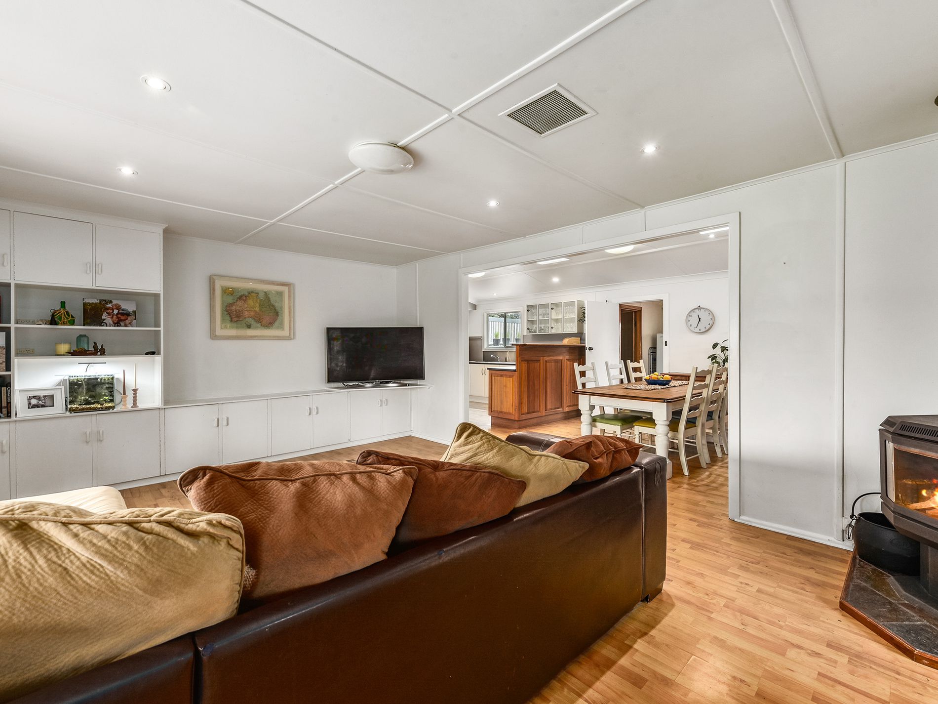Entering the home via the enclosed sunroom, you are greeted by the white and bright living area. The lounge features a built-in cabinet, display cases and includes both a free-standing slow combustion wood fire and reverse cycle air conditioner.