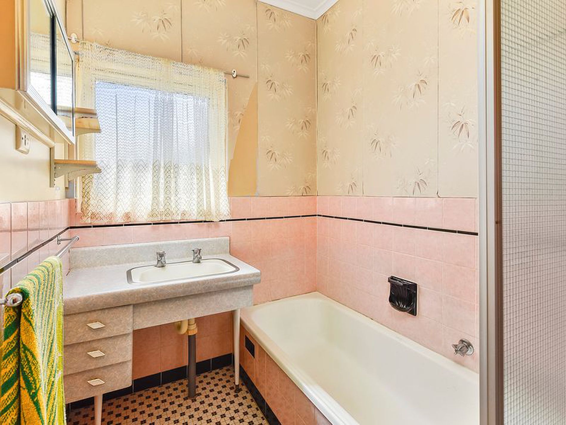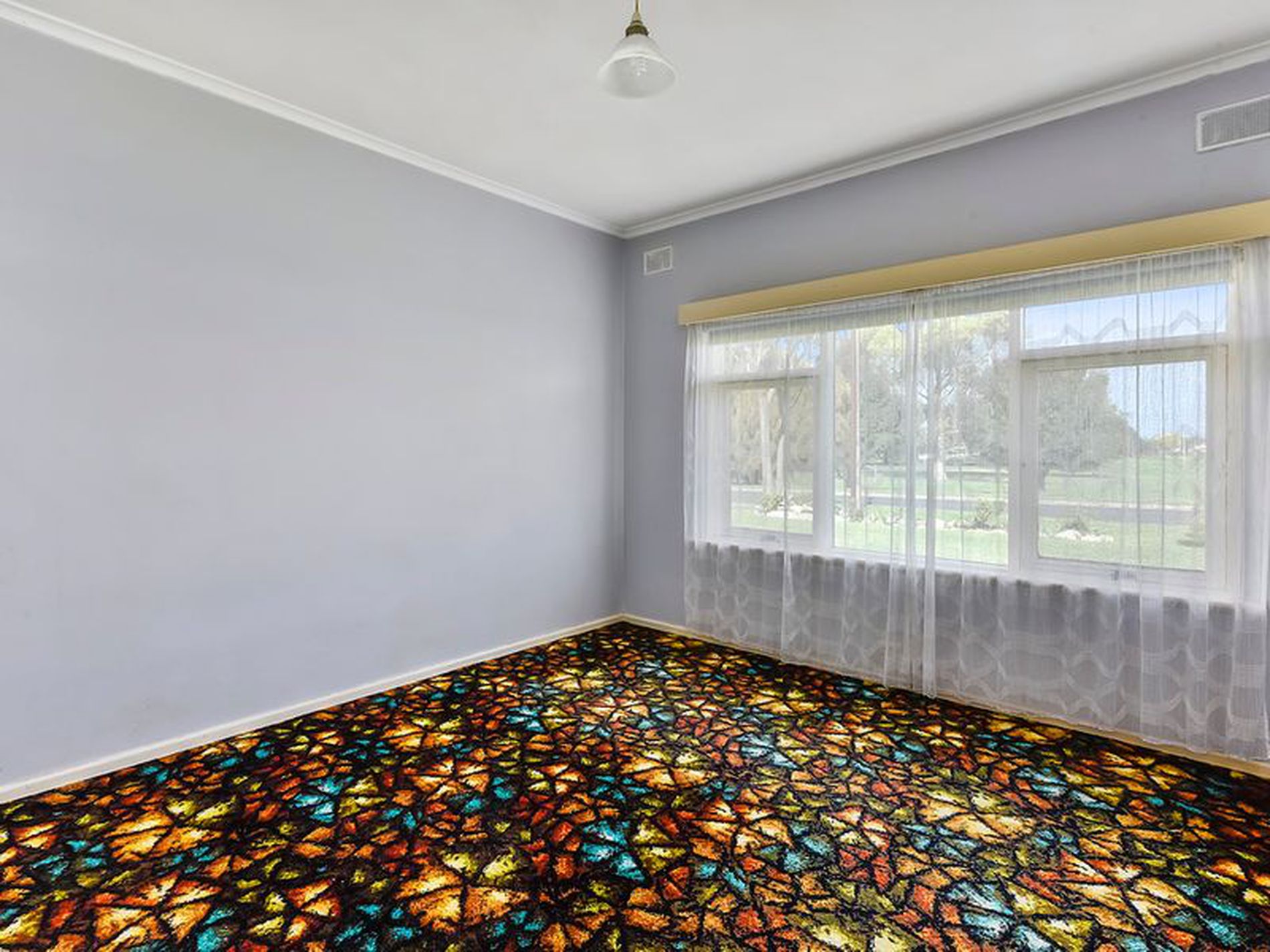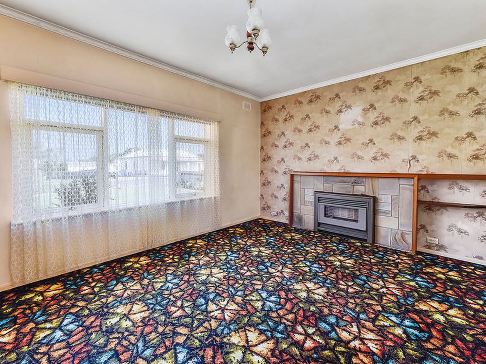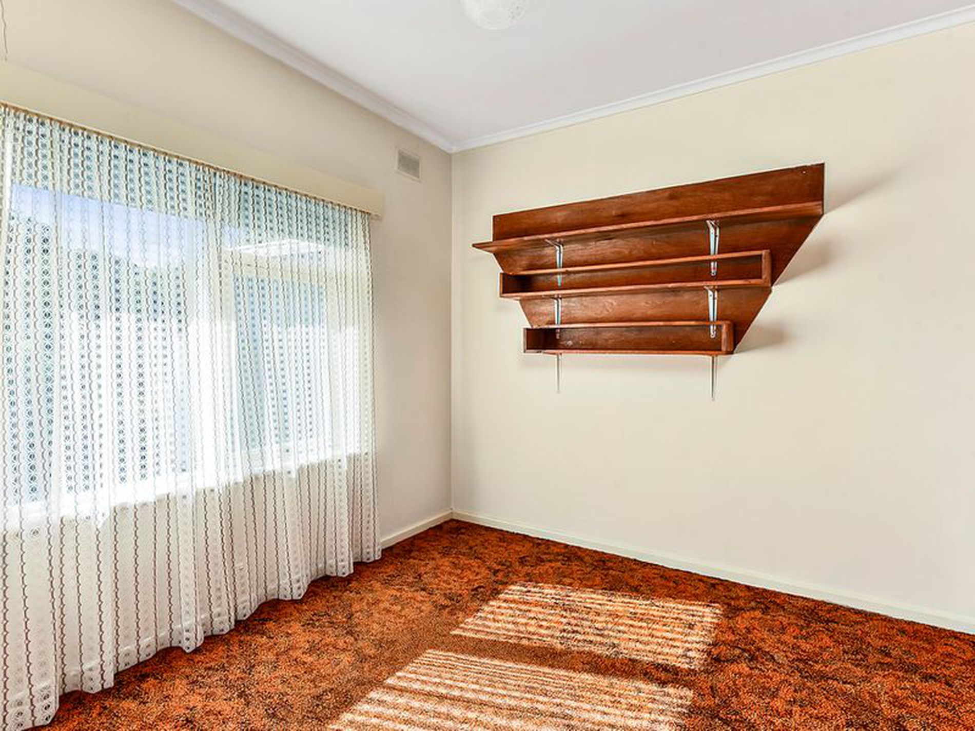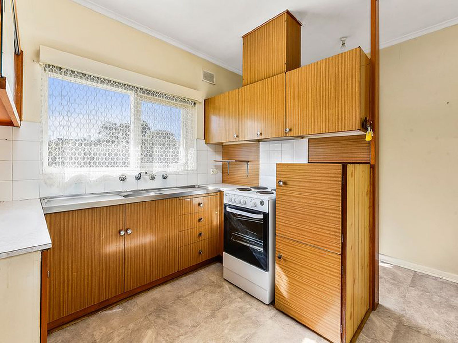 The lounge room is carpeted and has double doors which lead into the kitchen, dining area. This area is original with lino floors and electric cooking.