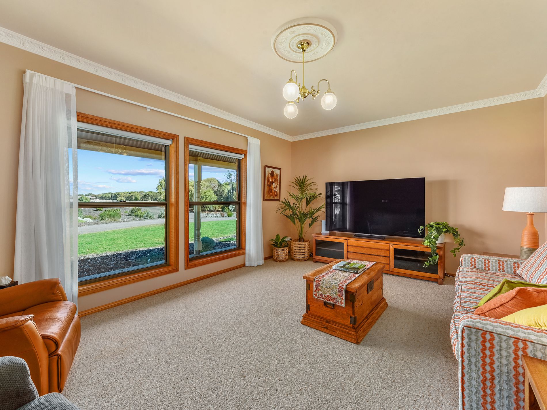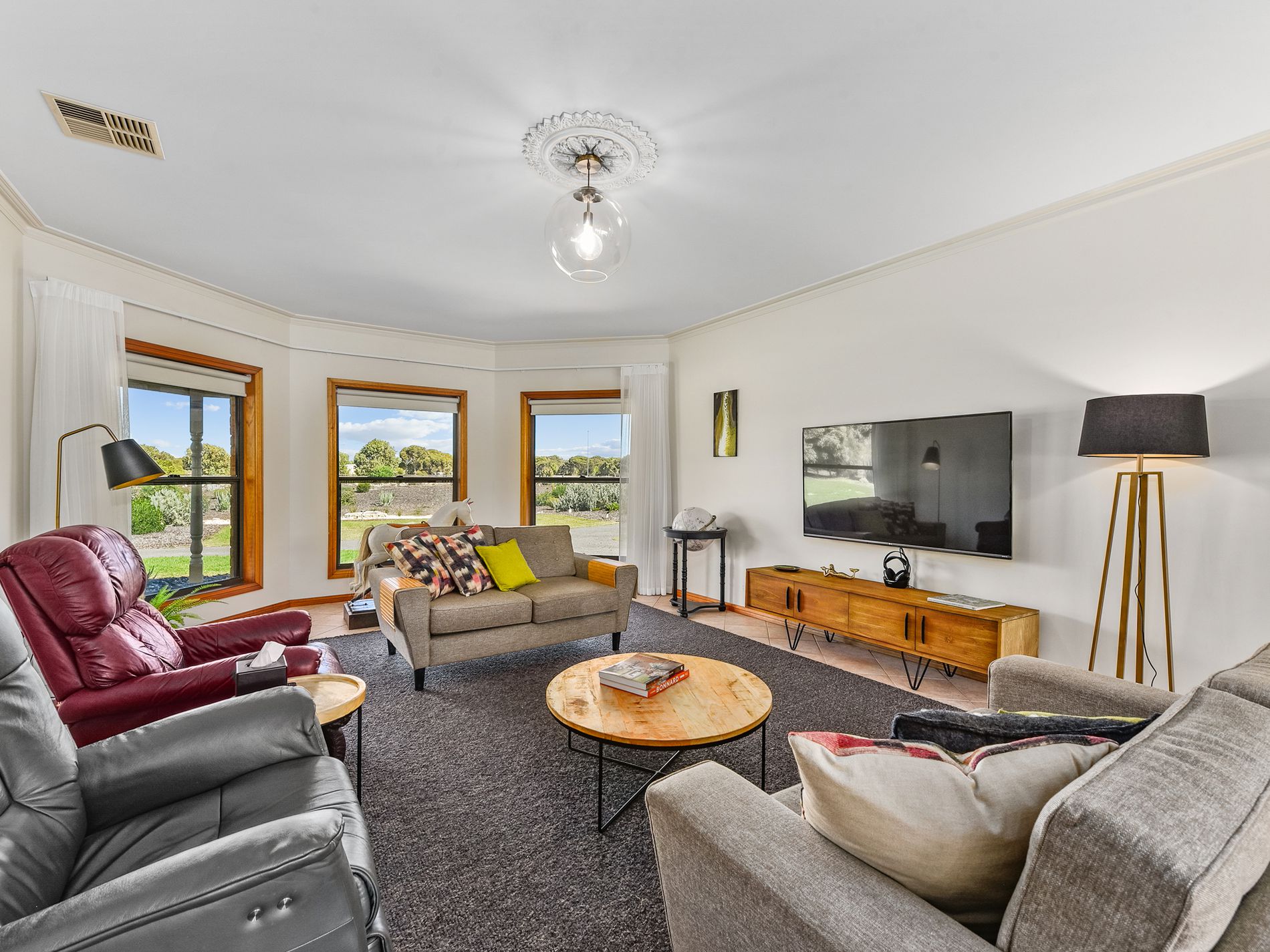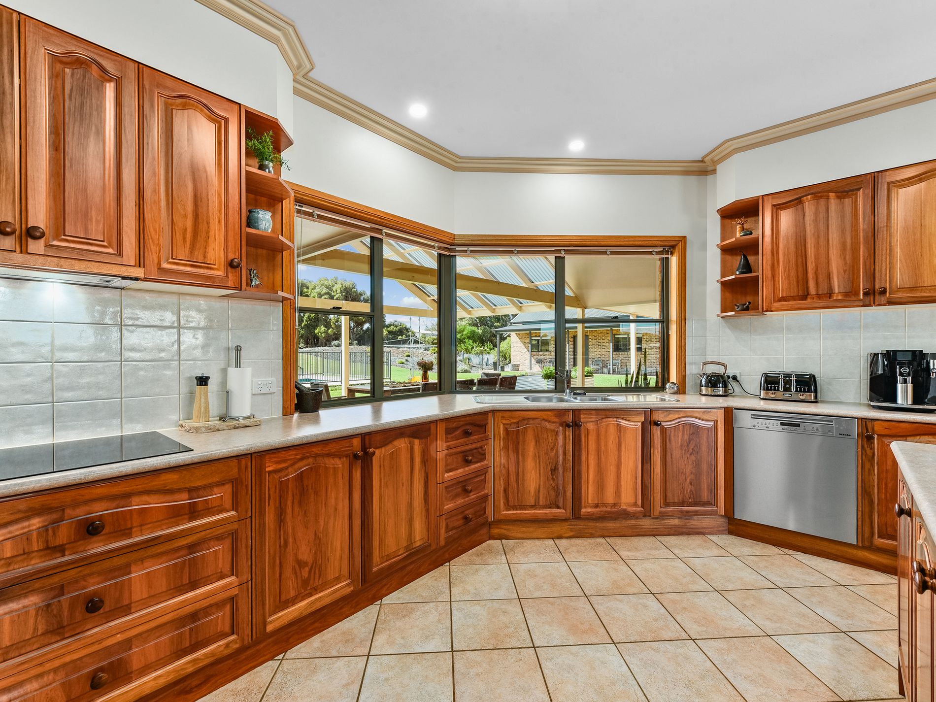 The heart of the home is its Blackwood custom kitchen, complete with induction cooktop, Miele dishwasher, island breakfast bar, plumbed fridge and a walk-in pantry. Overlooking the scenic rural backdrop, the kitchen seamlessly connects to an open dining area.