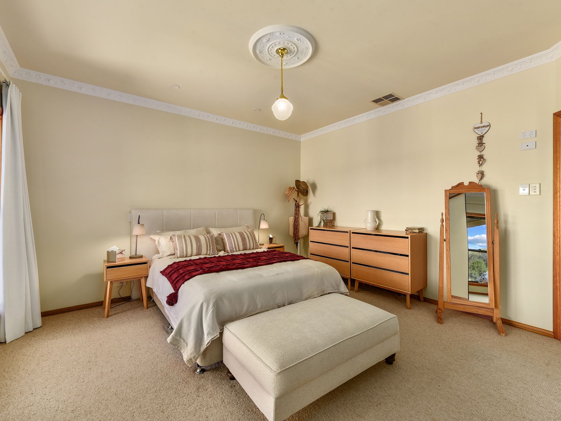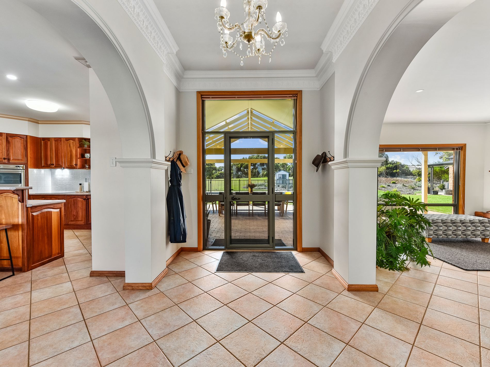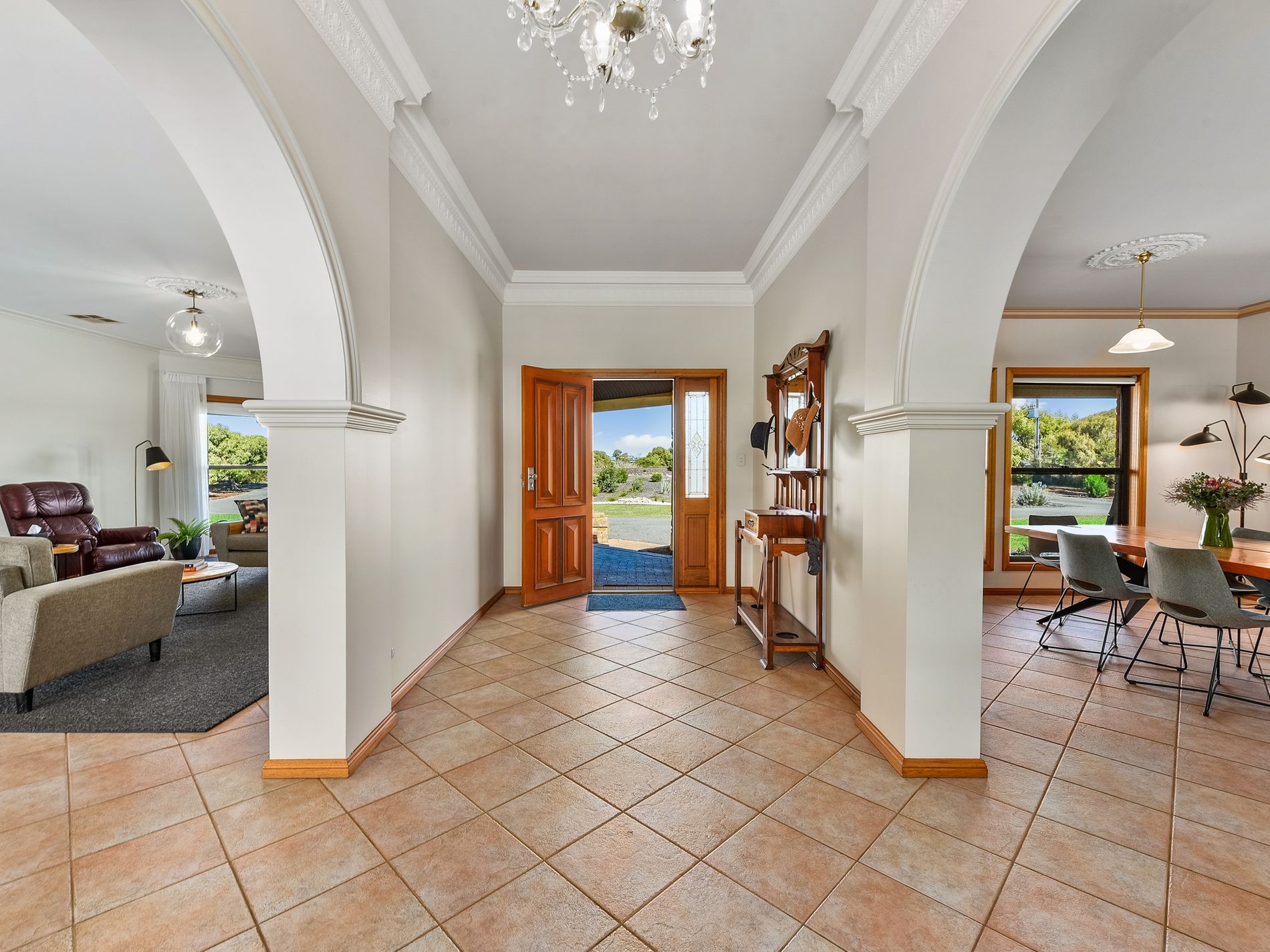 The heart of the home is its Blackwood custom kitchen, complete with induction cooktop, Miele dishwasher, island breakfast bar, plumbed fridge and a walk-in pantry. Overlooking the scenic rural backdrop, the kitchen seamlessly connects to an open dining area.