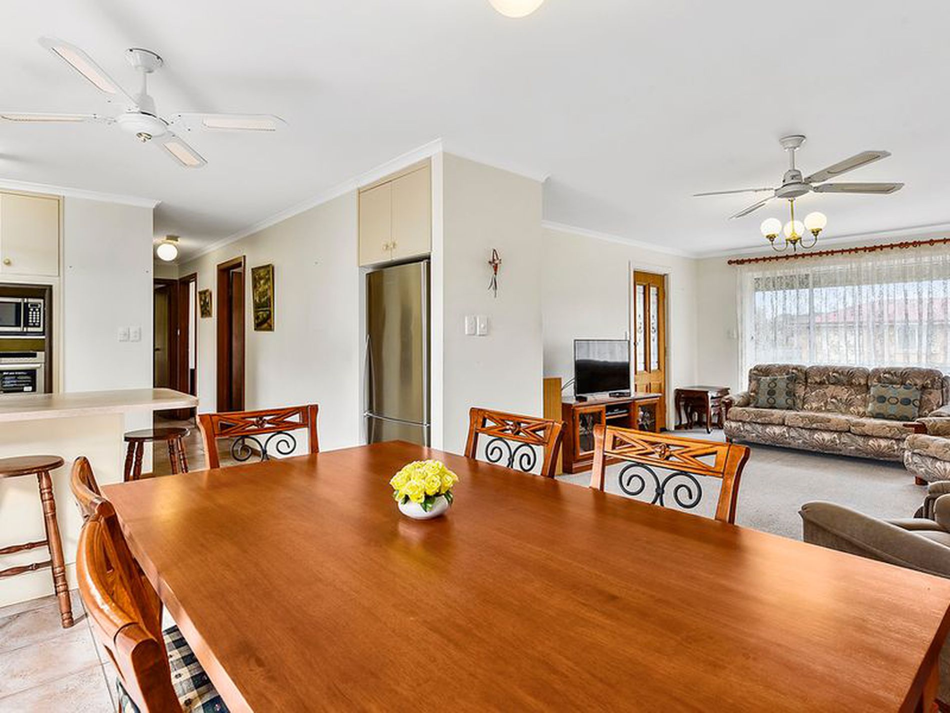 The open plan kitchen, dining , living is an abundant space, the living area is carpeted has the front door entry and a ceiling fan. The kitchen and dining area are tiled, the kitchen has ample cupboards and bench space and electric cooking, there are glass sliding doors from the dining area to the outside verandas and entertaining areas. This whole area is climate controlled by reverse cycle air conditioning.