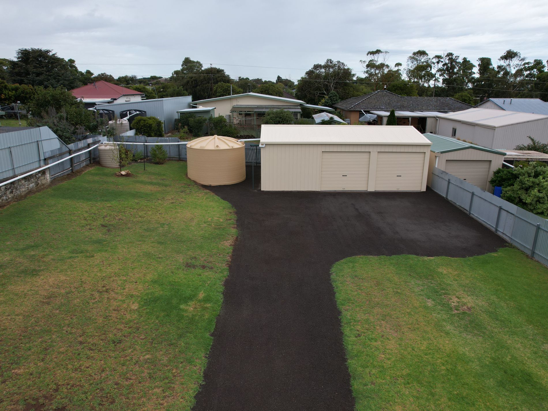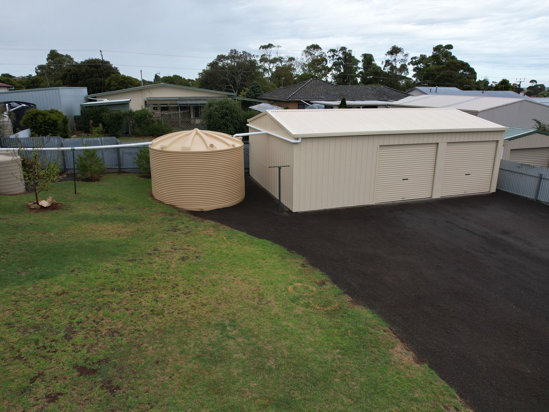 Completing the package, a spacious pad lays before the shed, accompanied by both a 22,500L and a 1500L rainwater tank.