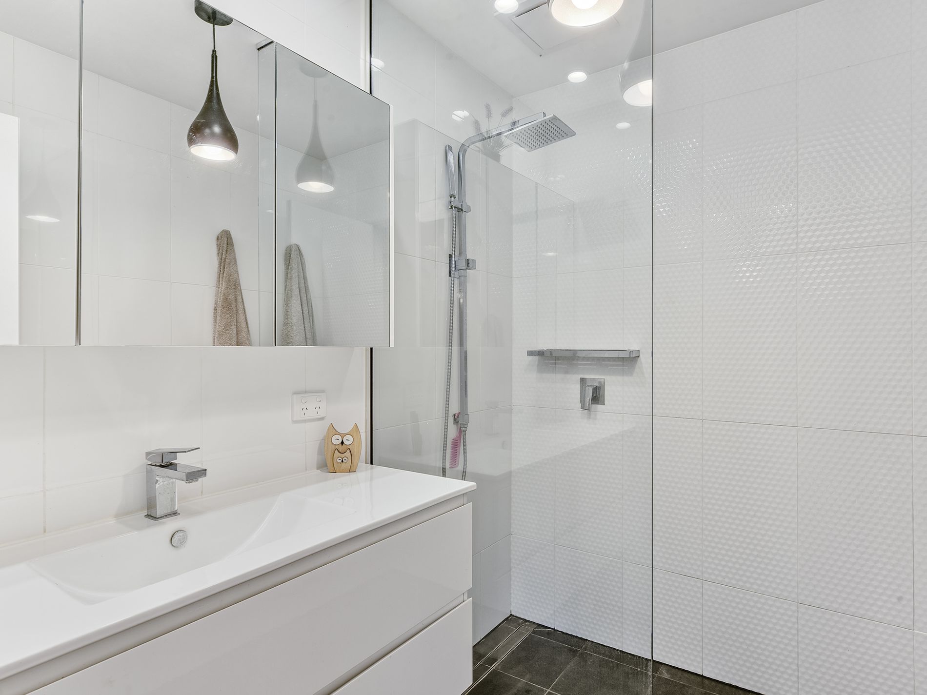 The bathroom is a modern gem featuring bright white tiling, glass shower screen, and large vanity. The separate toilet is located close by.