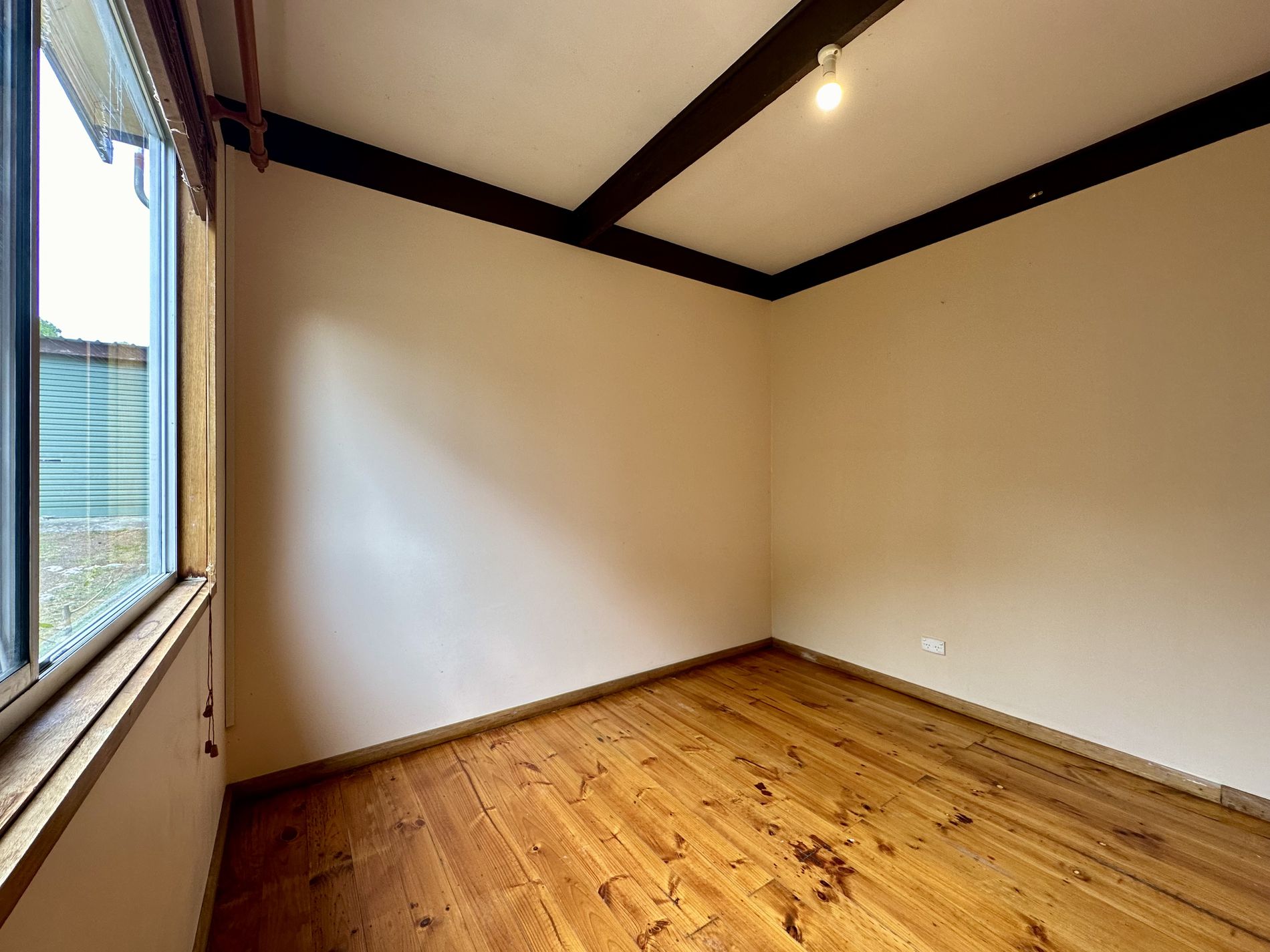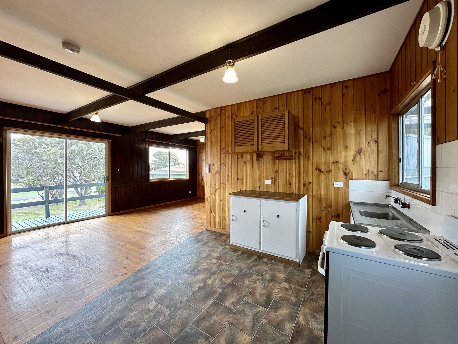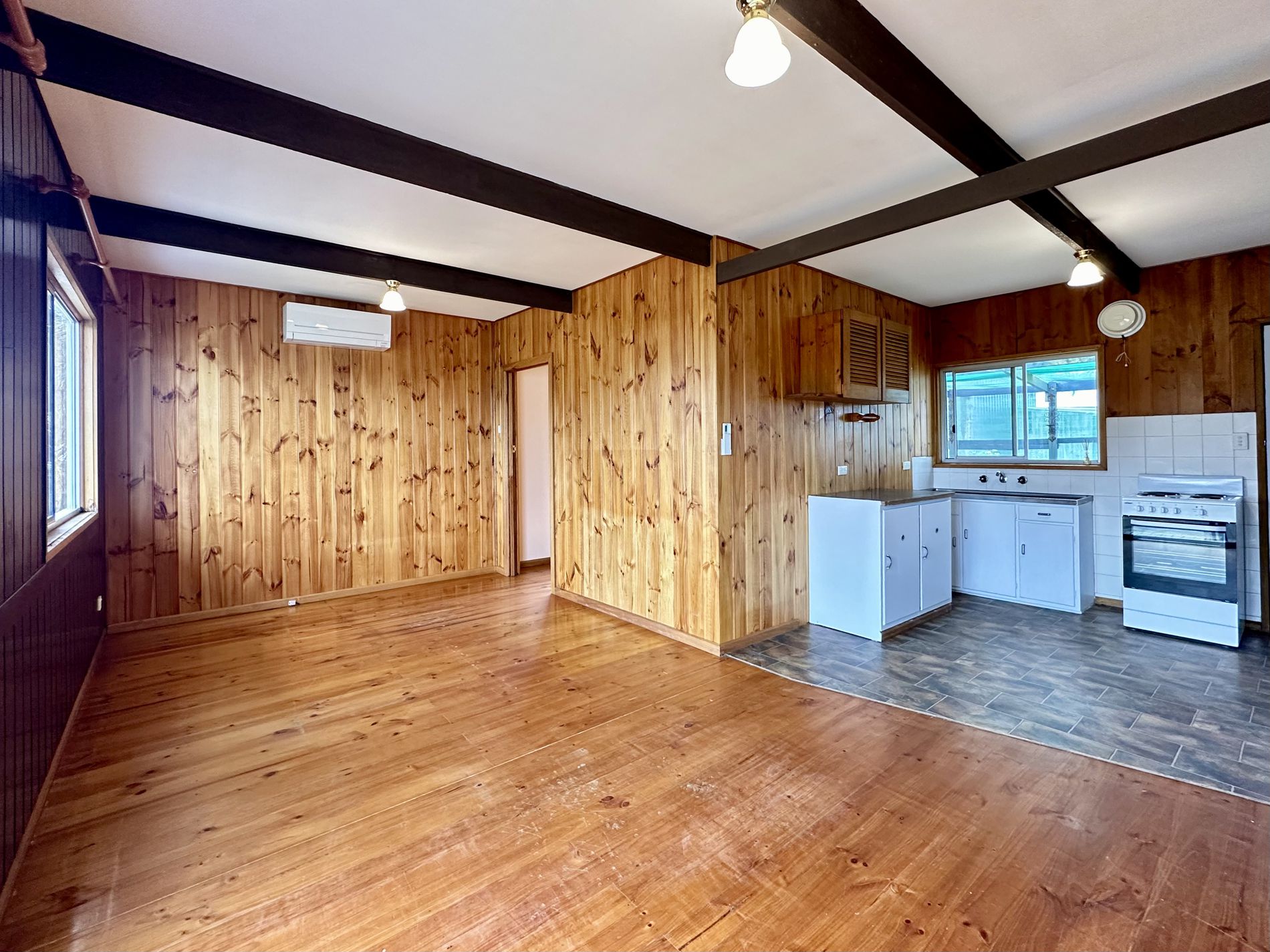 From the front veranda step into a light filled open plan living and kitchen, featuring views of the yard through the large sliding door and windows. A centrally located reverse cycle air conditioner is mounted to ensure all year comfort.