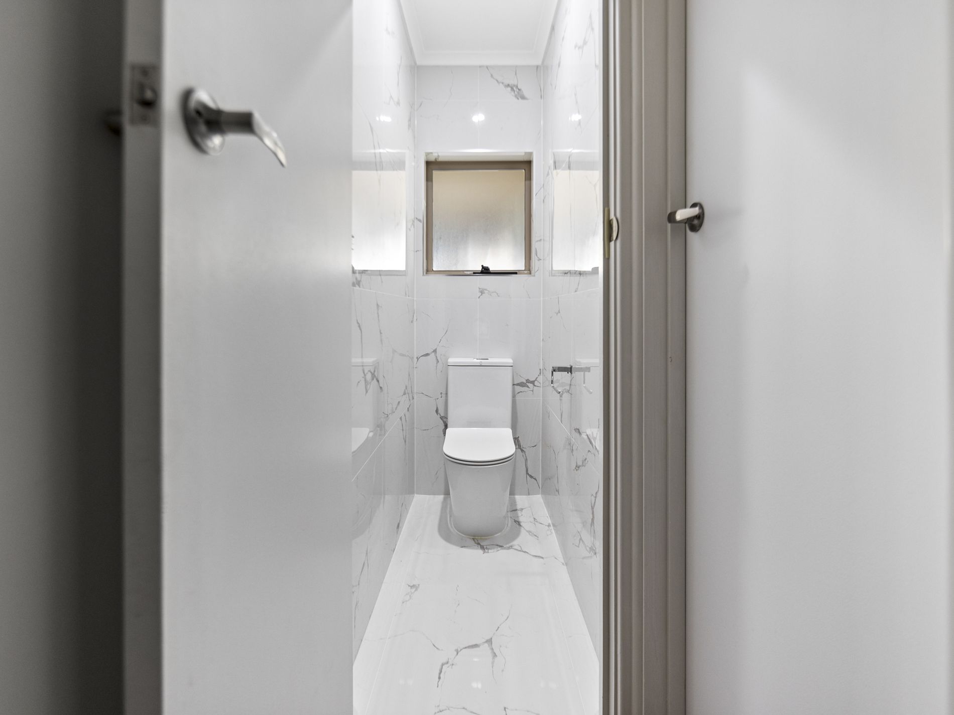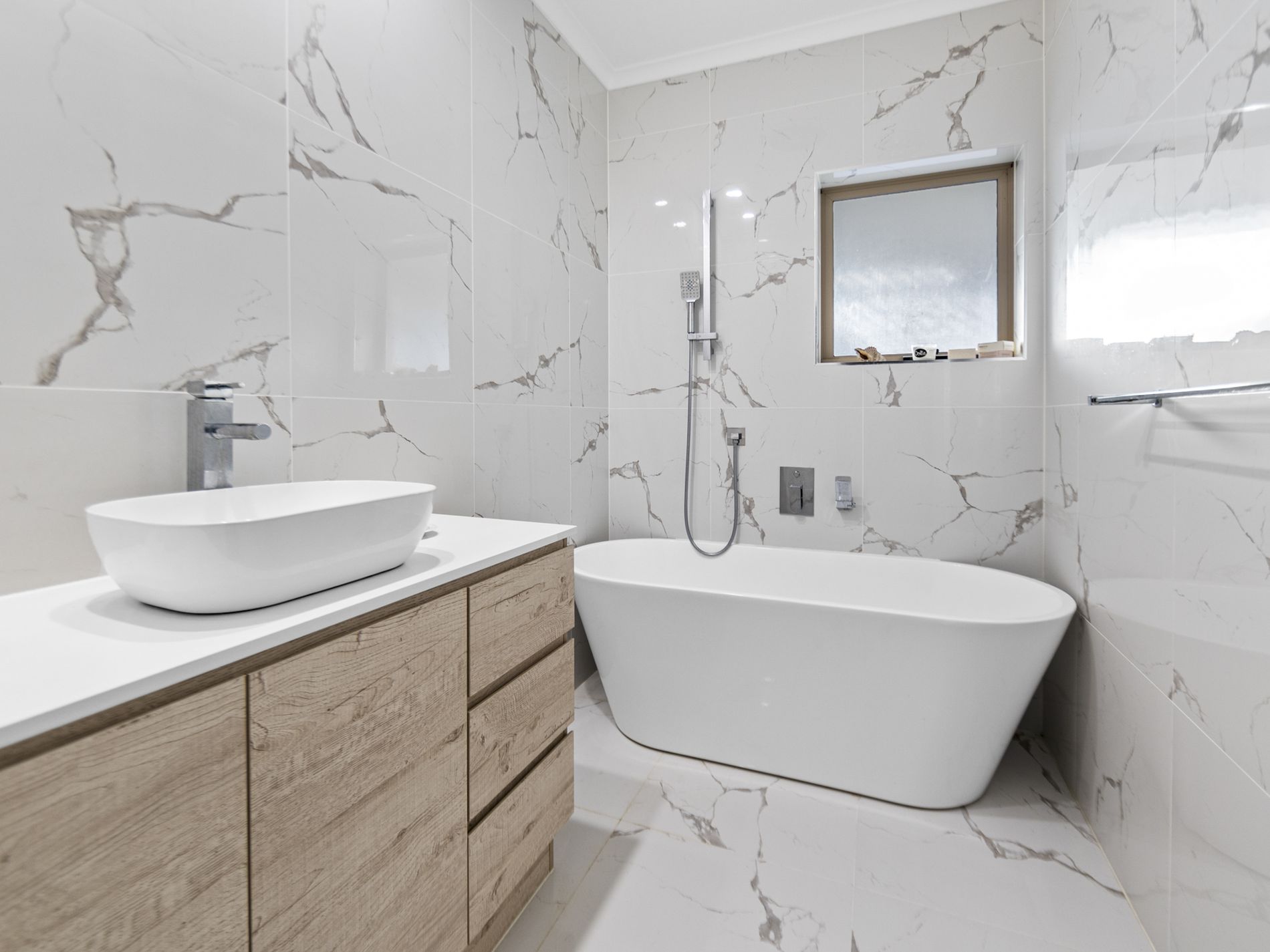 This thoughtfully designed home comprises three bedrooms, each equipped with ceiling fans and a built-in wardrobe for added convenience. The elegantly renovated bathroom evokes a spa-like atmosphere with floor-to-ceiling tiles, a sleek vanity cupboard, and a freestanding oval bath - a perfect retreat to melt away the stresses of the day. The shower over the bath and a heat lamp offer warmth during chilly winter days. A brand-new fully tiled toilet and a well-appointed laundry with built-in bench space complete the internal layout.