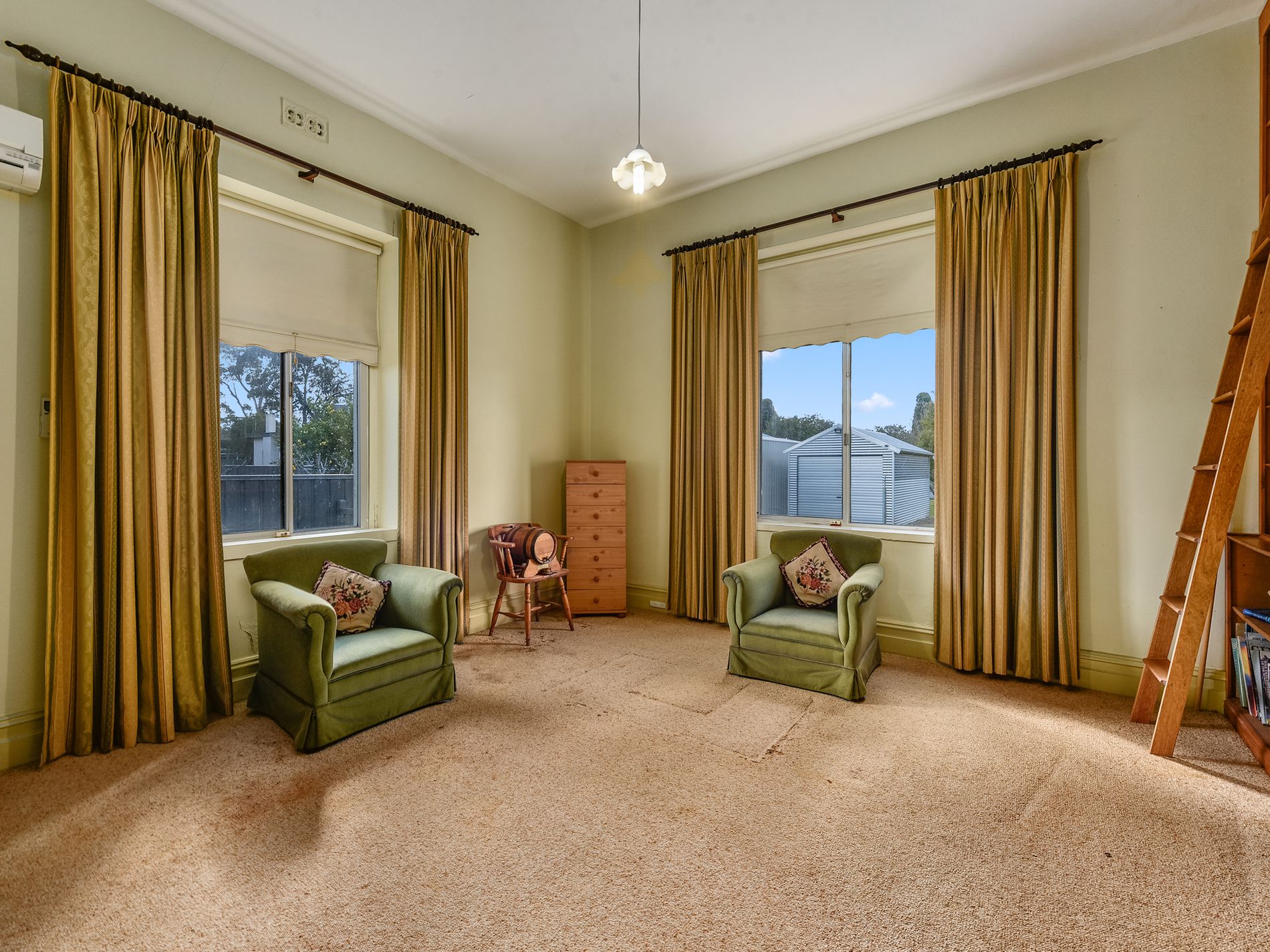 As you enter, a wide hallway with timber floors greets you, flanked by a spacious bedroom with built-in robes and a cozy fireplace. Across the hallway, you'll find a versatile formal lounge/library or fourth bedroom, complete with an open fire and reverse cycle air conditioning. Both rooms feature carpet, beautiful ornamental fireplaces, and curtains.