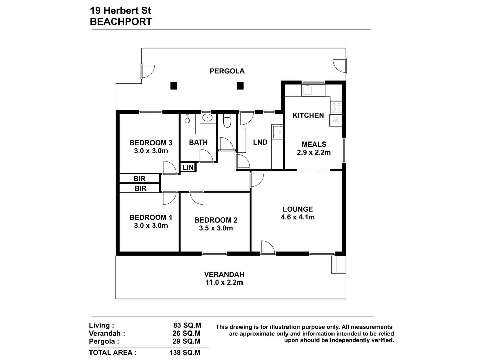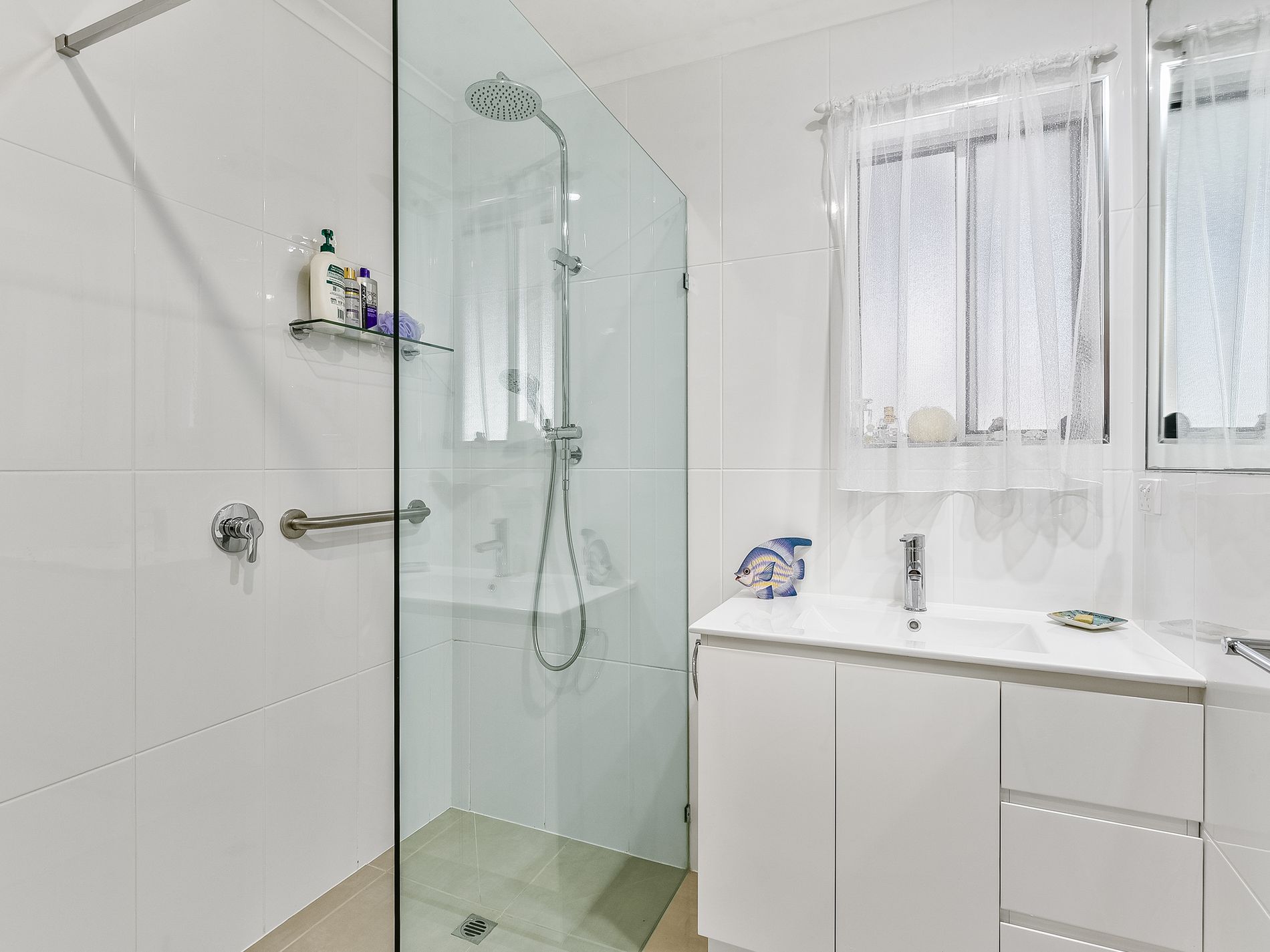 The modern bathroom is designed with a spacious walk-in shower and a sleek vanity, and the toilet is conveniently separate. The tiled laundry features built-in cabinetry and provides rear access to a screened-in, paved pergola area—an ideal spot for family gatherings and cozy evenings with friends.