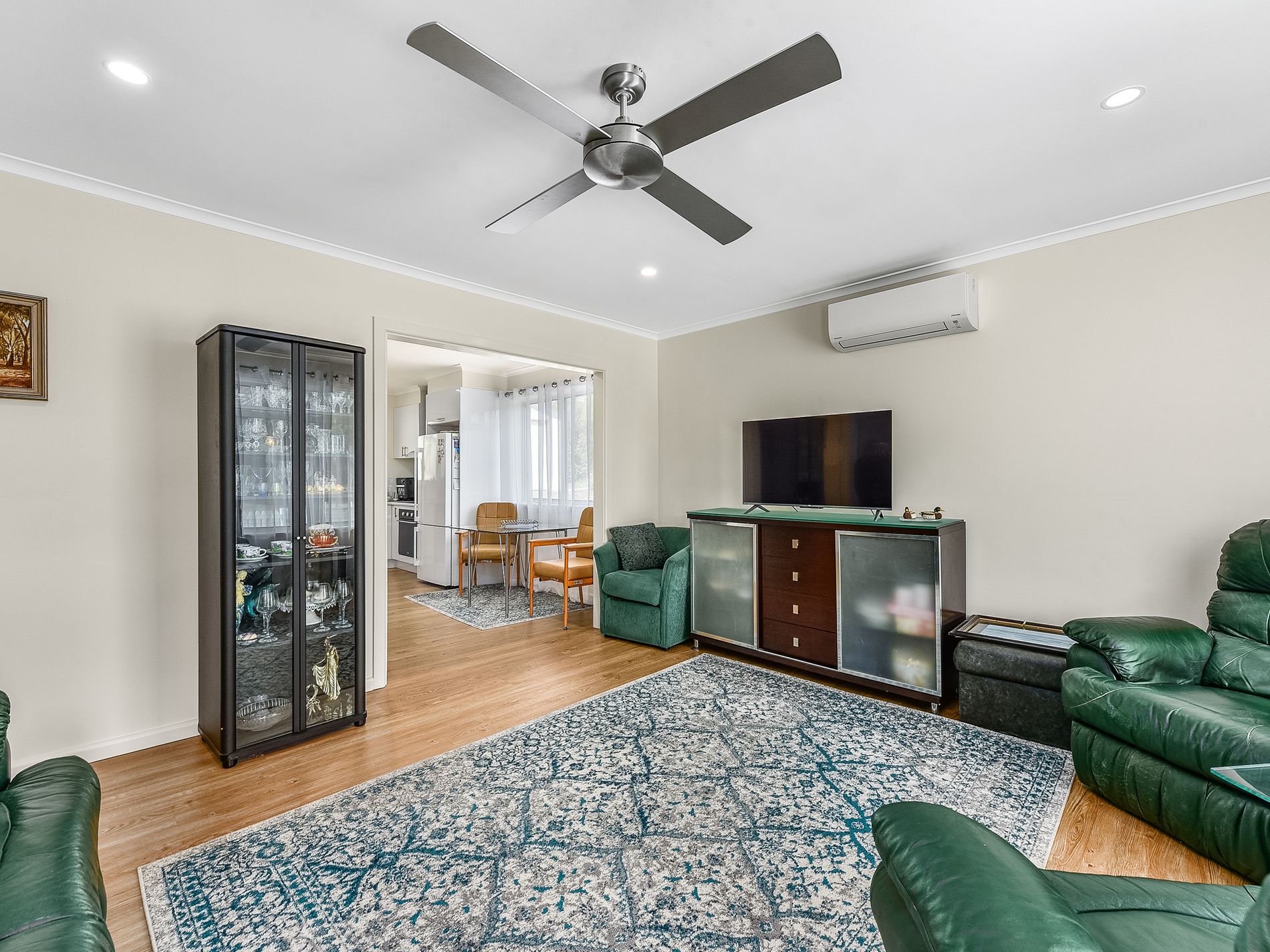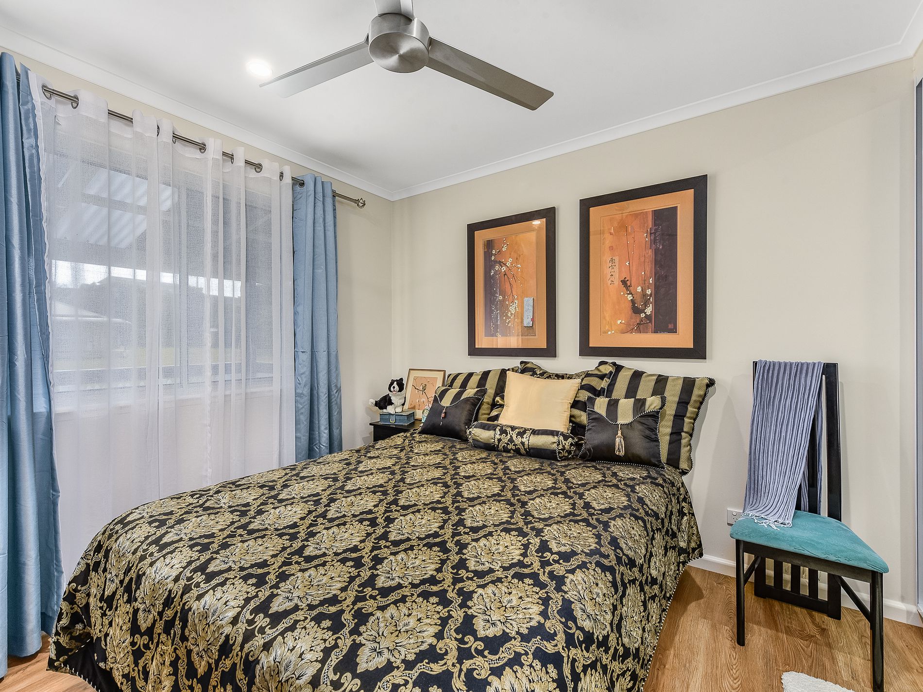 The kitchen boasts quality appliances, including electric cooking, a dishwasher, and a pantry, making it perfect for culinary enthusiasts. A hallway leads you to three well-appointed bedrooms, all featuring floating laminate timber floors and ceiling fans, with two of them offering built-in robes for added convenience.