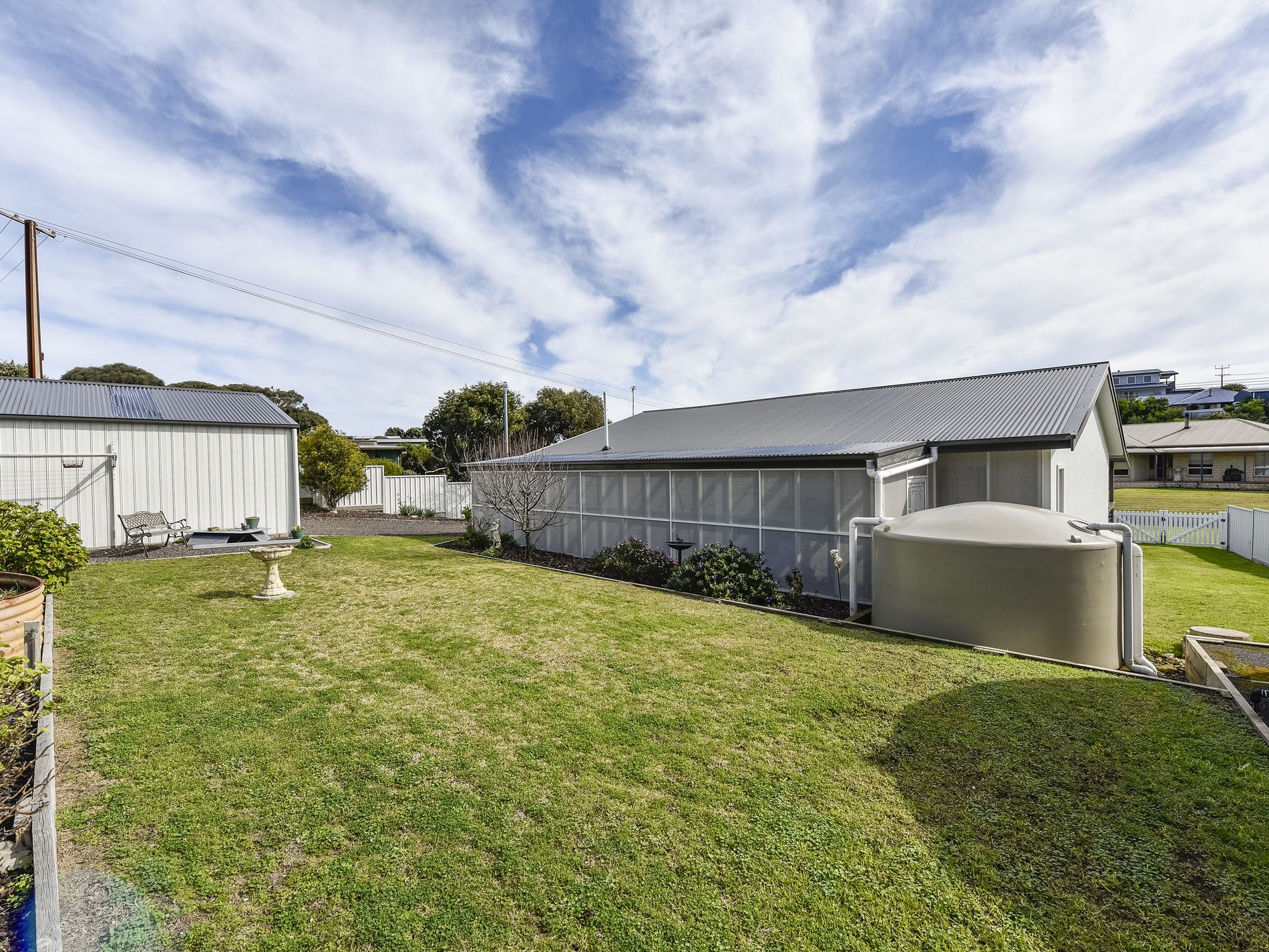 A driveway leads you to the rear double car shed, complete with a cement floor, power supply, and an electric roller door. The private backyard features a lush lawn area and established gardens, providing a tranquil retreat. The home is equipped with copious amounts of rainwater for added sustainability. Currently even used for watering the garden reducing water rates significantly.