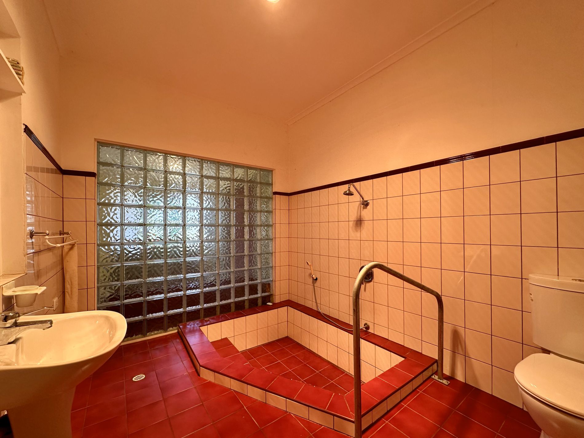 The tiled bathroom boasts a shower over large sunken bath, vanity, and toilet.
