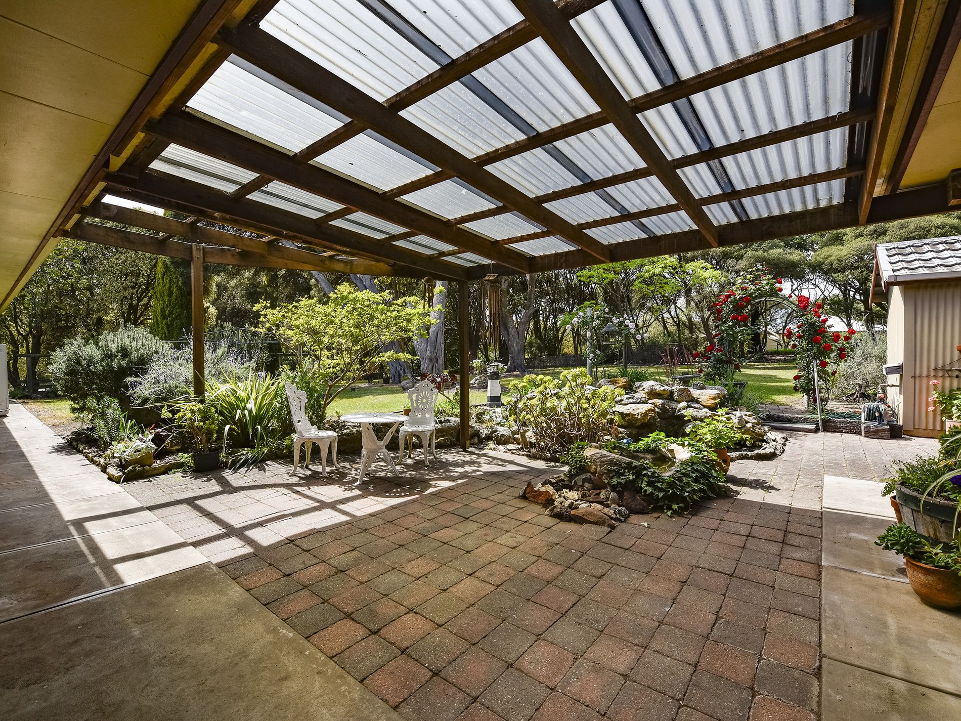 A driveway leads you to the house, which proudly sits atop the allotment. The solid brick and tile home, built by Empak Homes, invites you to experience a blend of practicality and style. The garage, with side access to the rear of the property, leads you straight to the kitchen via an open pergola—a perfect entry point after a day in the garden or on the property.