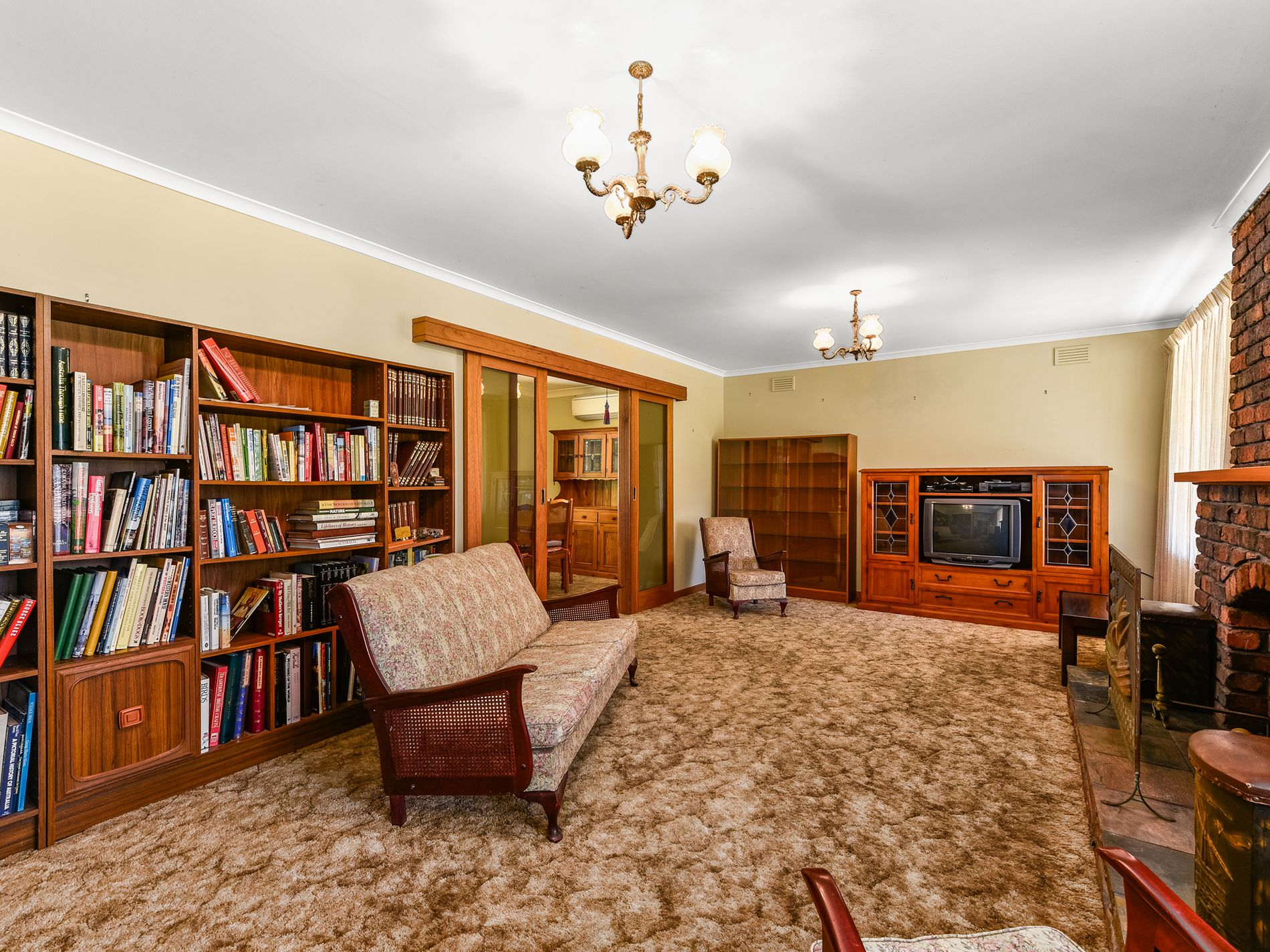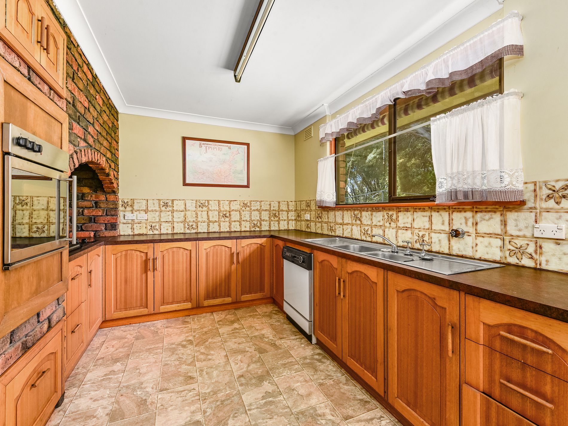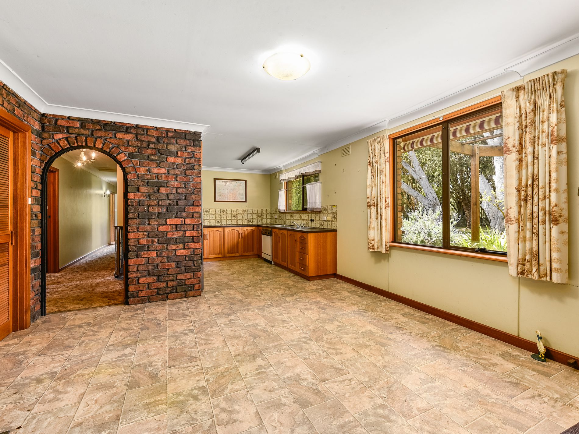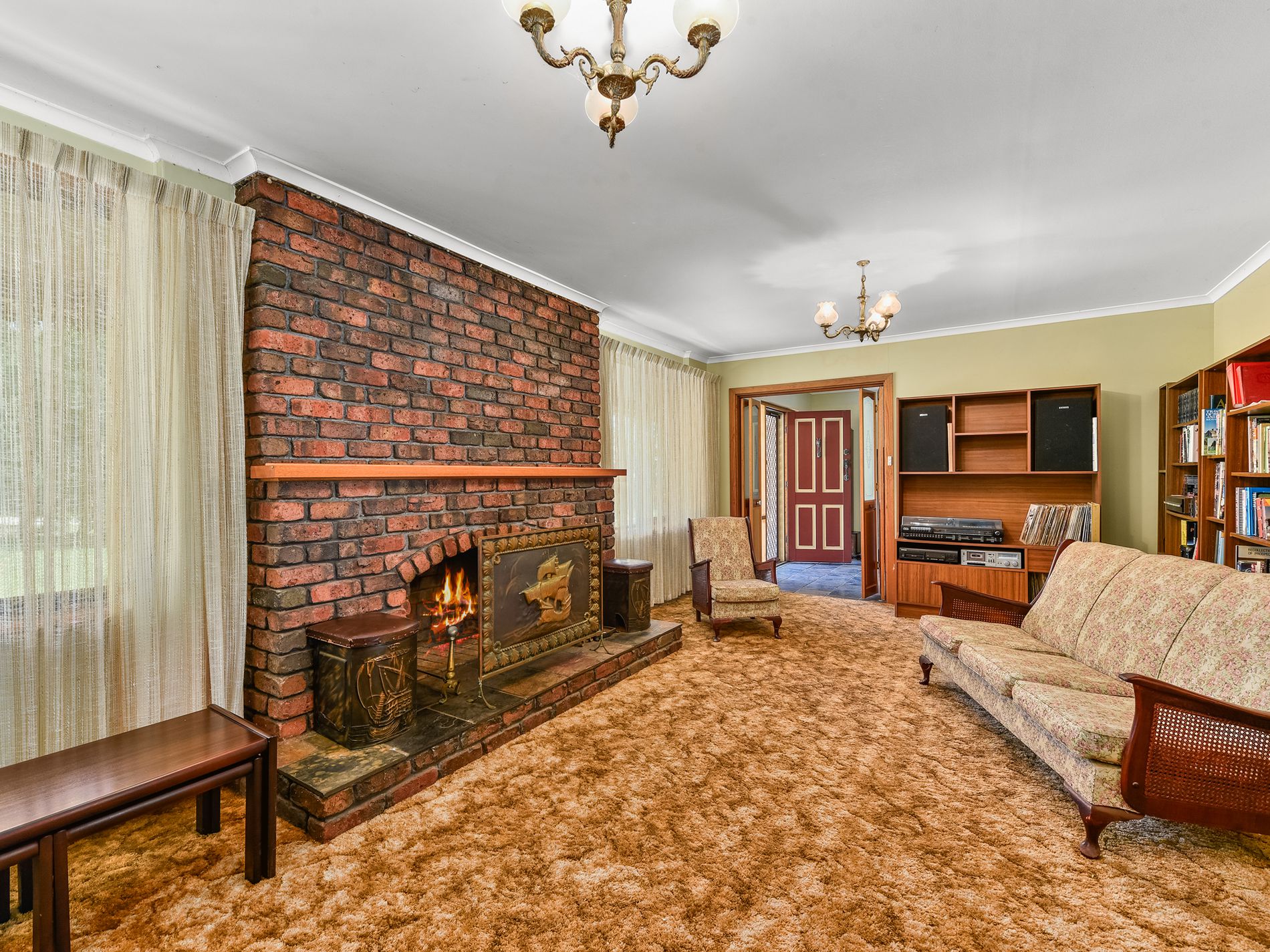Upon entering the home, you'll step into a tiled area that flows seamlessly into the carpeted lounge. This inviting space features brick accent walls and an open fireplace, exuding warmth and coziness. A second slow-combustion fire adds extra comfort during cooler months.