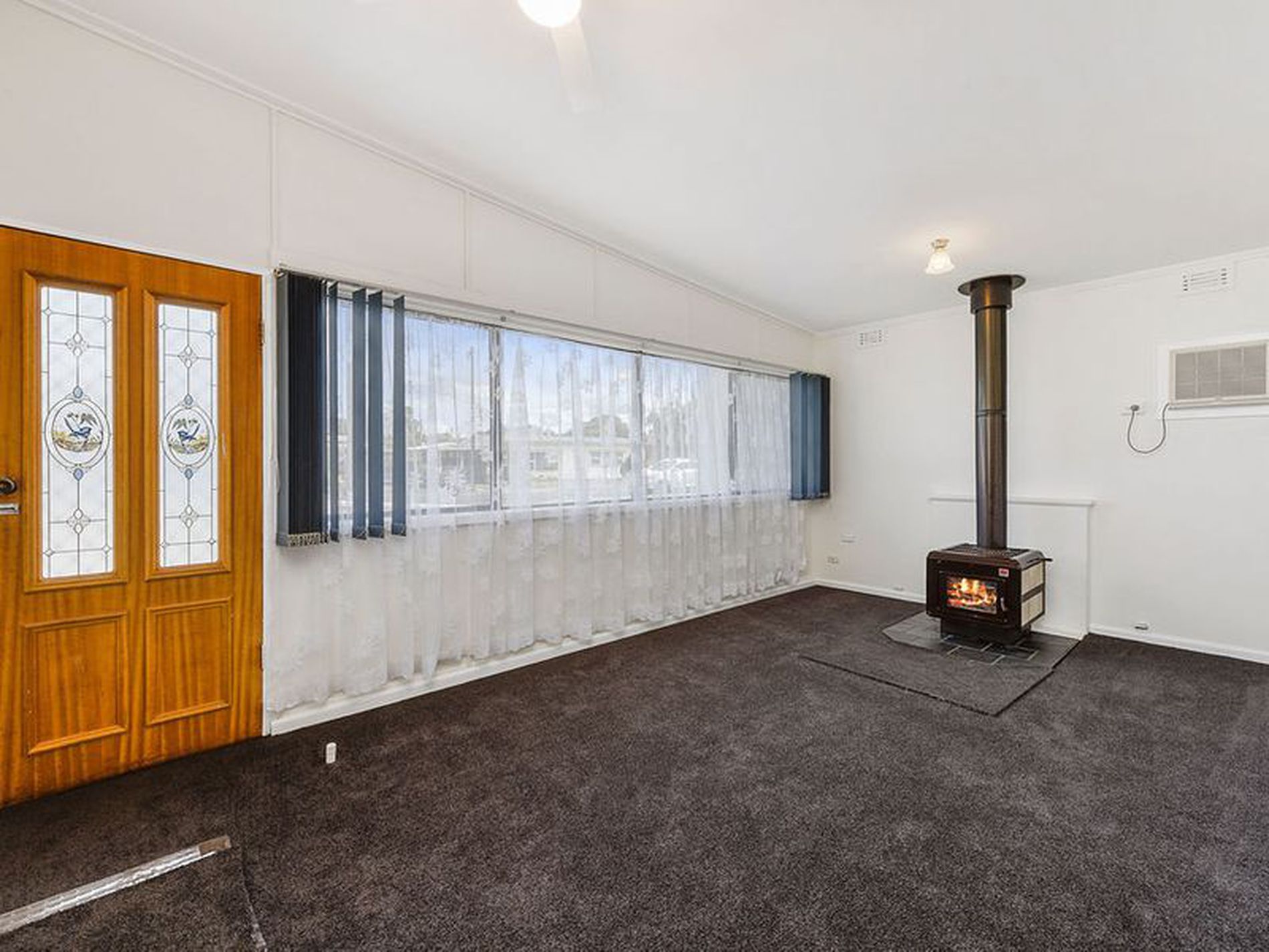 Step inside through the front door into the welcoming open-plan kitchen, dining, and living area. The carpeted lounge is equipped with blinds, a slow combustion wood heater, reverse cycle air conditioning, and a ceiling fan, ensuring comfort throughout all seasons.