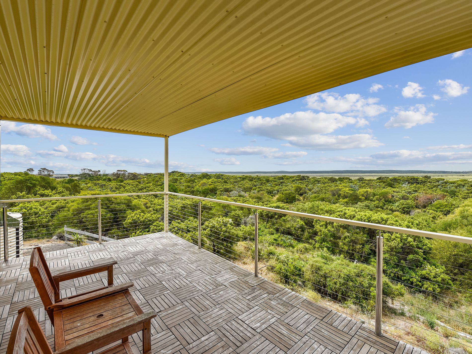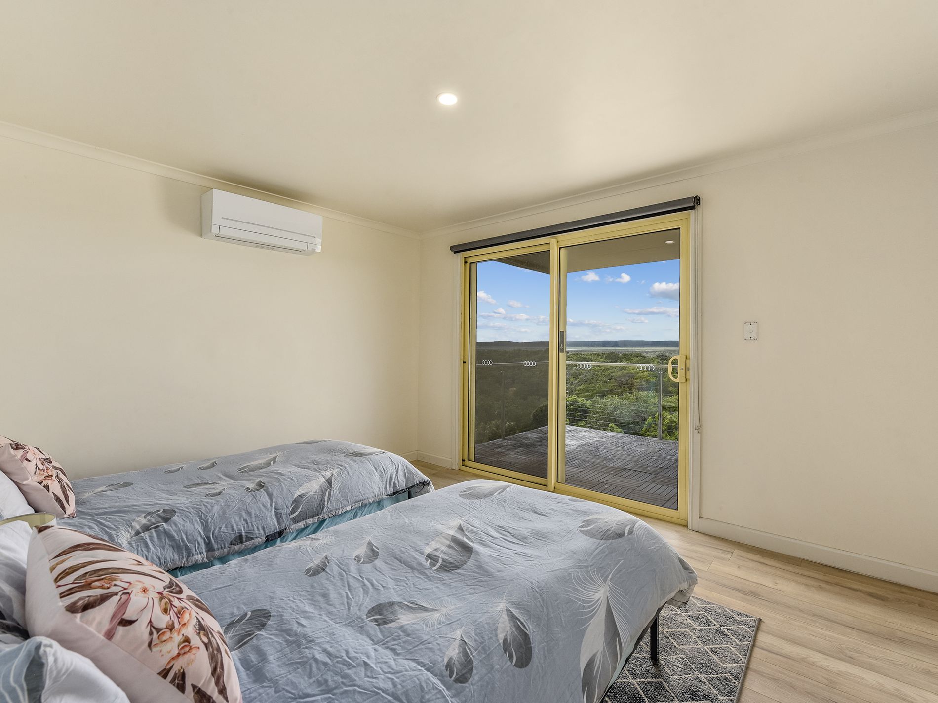 Next is the retreat. Currently being successfully ran as a holiday stay. This two-story picture-perfect home could also be your answer for intergenerational living. Built specially for the holiday market, the retreat is accessed via a separate drive- in of Iluka Road. The location was chosen for both privacy from the main home and for the views. And what amazing view they are. From the upper front deck, you look out over the farmlands all the way to Rivoli bay. The rear upper deck looks over the natural scrub areas and on to the sweeping farmlands. The sun sets and sunrise from these vantage points must be seen to be believed.
