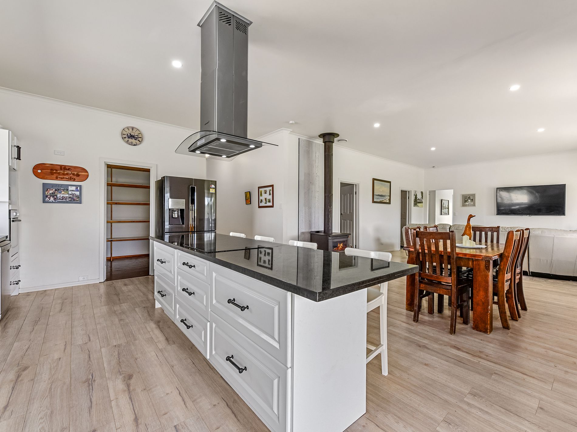 Upon entering the home via the large return verandah you are greeted by the large living area. The kitchen is the standout feature of the home with crisp white cabinetry, granite benchtops, pressed metal splashback, and black hardware. The pantry itself is huge, offering ample storage space. A free-standing slow combustion wood fire is cleverly located central to the home to allow perfect heat distribution. The dining and lounge areas flow seamlessly with the bright floating floors a standout. From the windows the views of ‘nature’s playground’ are incredible.