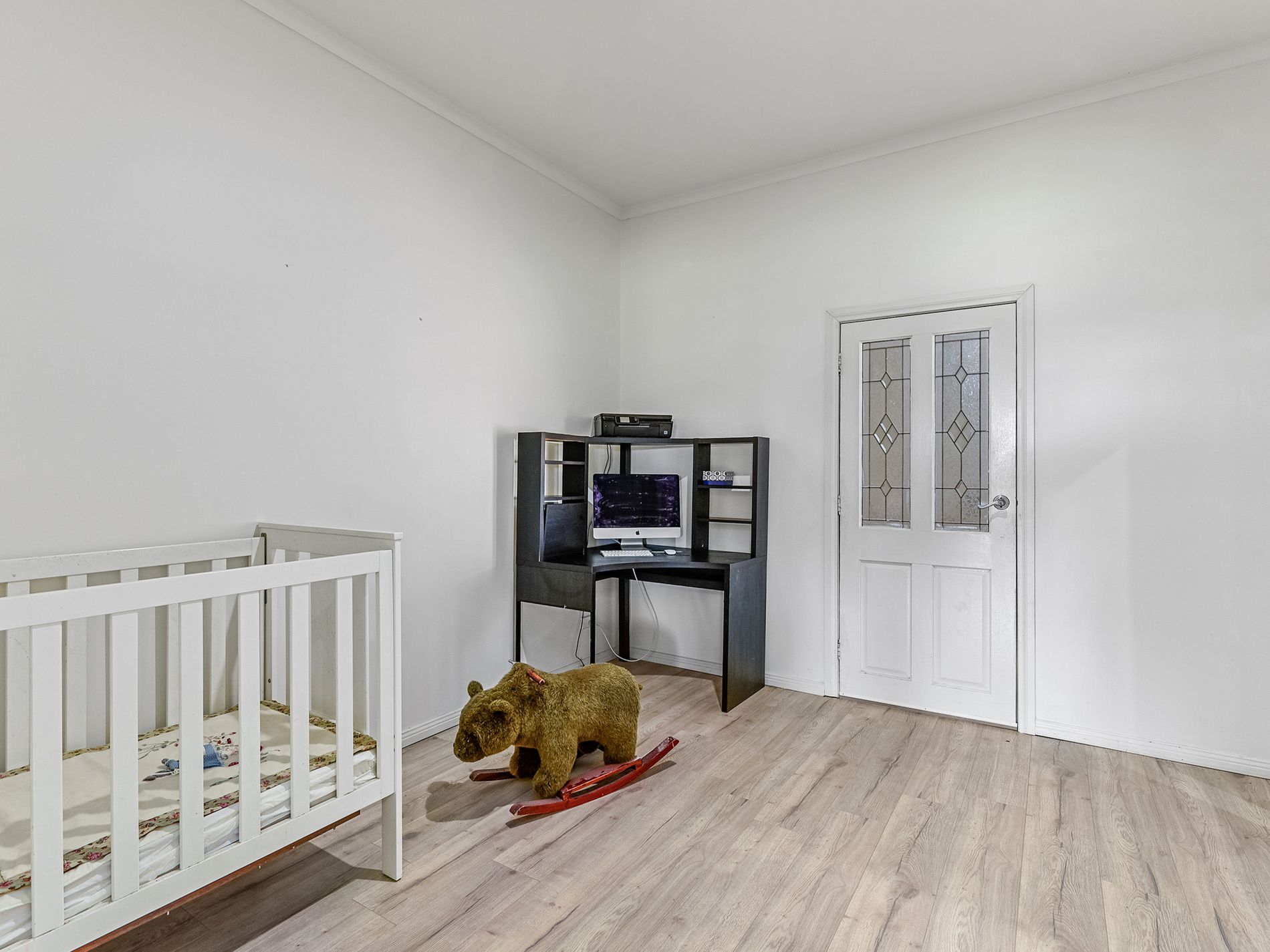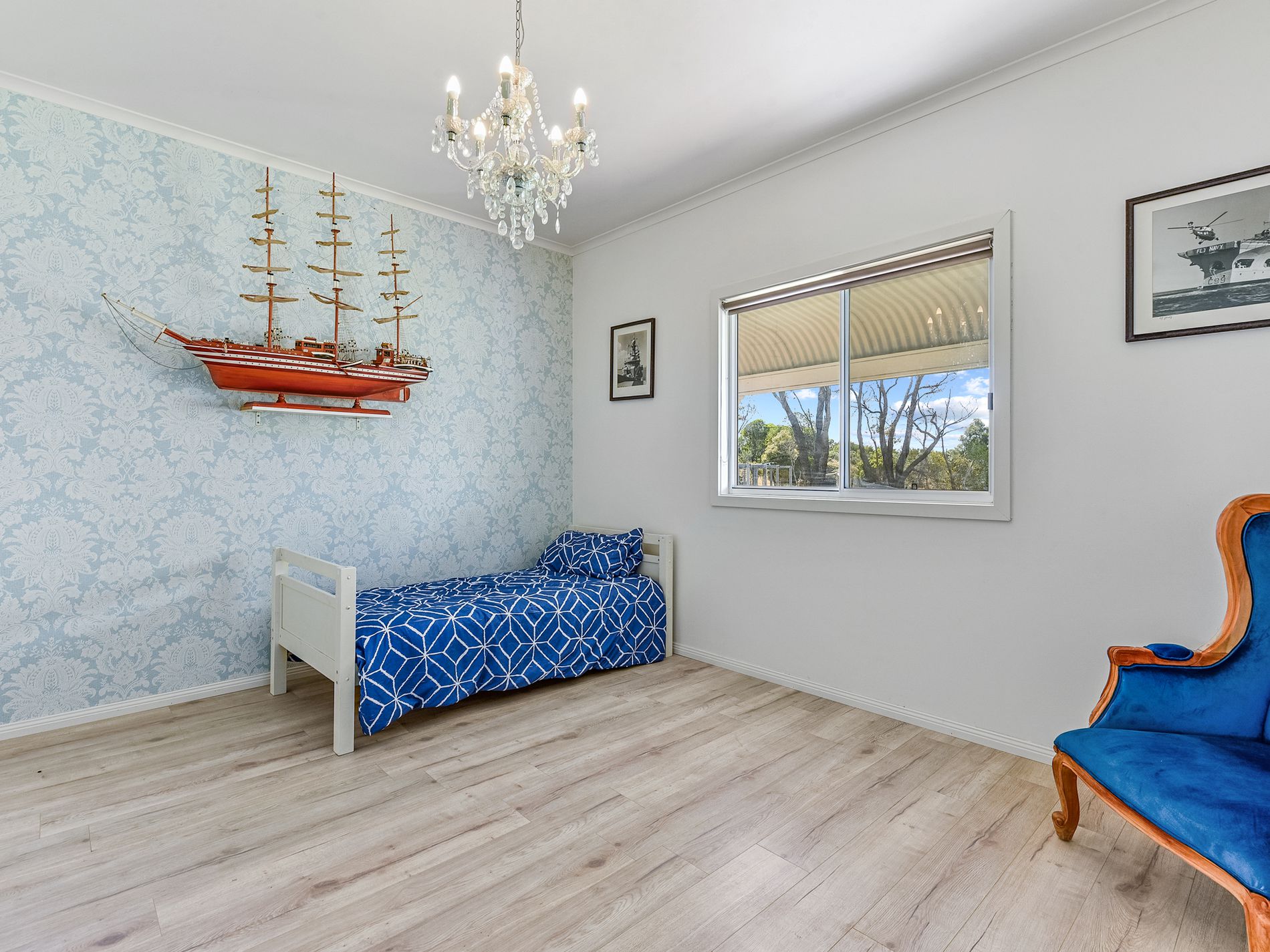 Bedroom two sits at the rear of the home. With a wall papered feature wall and chandelier, this comfy space could be easily utilized as a separate living room.
