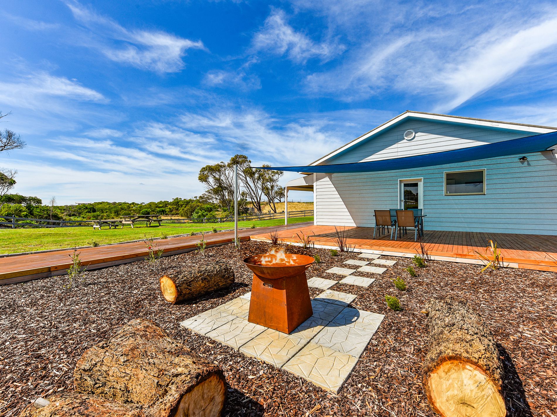 Through a door at the rear of the home is the outdoor entertainment space. With a huge, decked area cover by a shade sail, fresh planting and a fire pit area, entertaining the masses will be easy here. Rounding off the home is the garage at the rear.