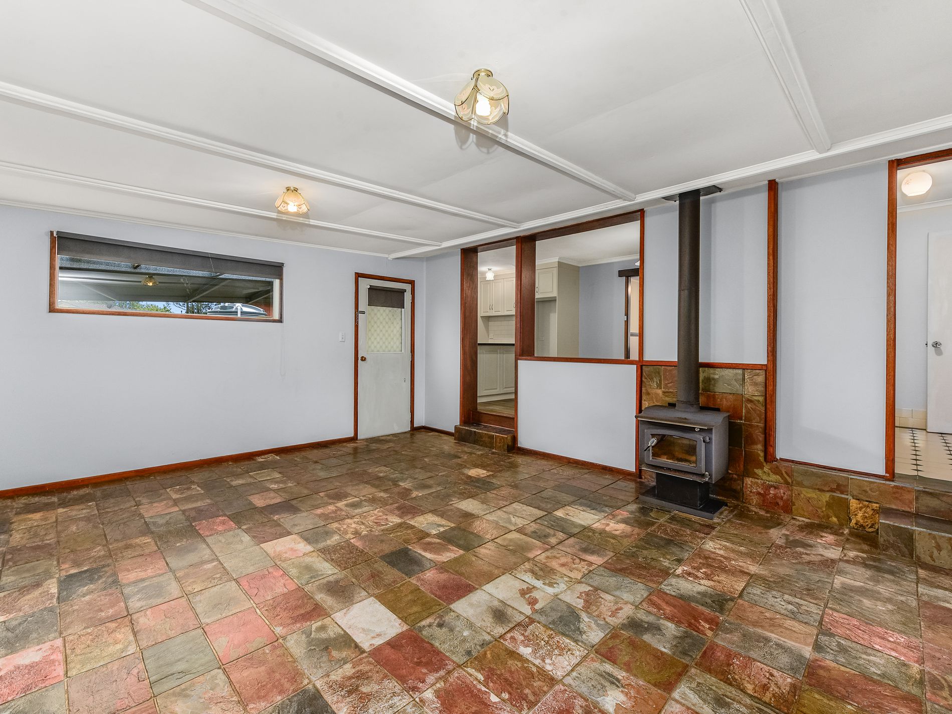 On from the kitchen you step down into the large family room. With the warm tone of the slate floor and the freestanding wood fire, this is the perfect place to snuggle down and read a good book in the heart of winter. Alternatively for the warmer months there is a reverse-cycle air-conditioner as well.