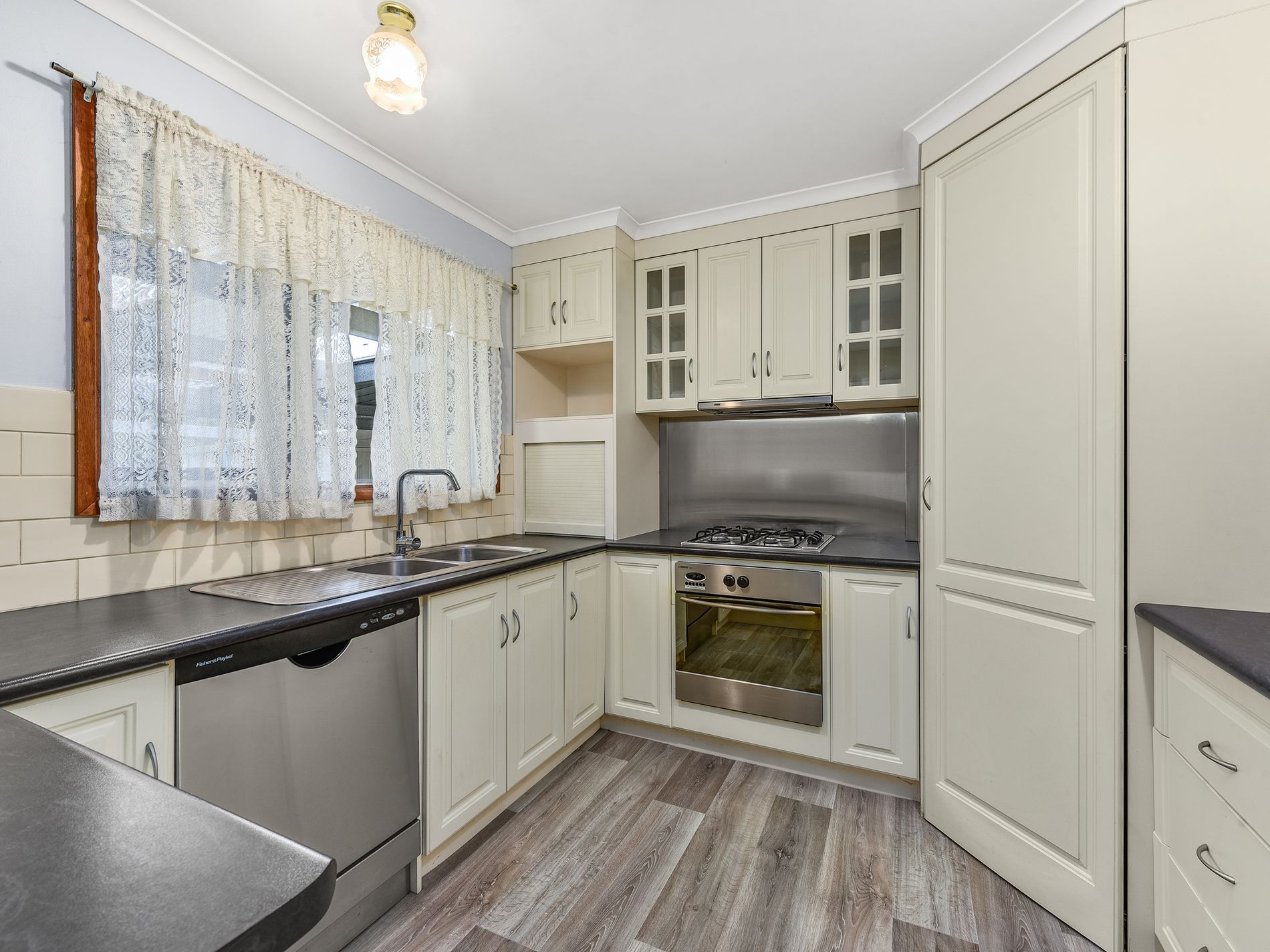 The wet areas present well and include a large bath, free standing shower, vanity, separate toilet, and a well-equipped laundry. Two large linen presses down the passageway offer plenty of storage.