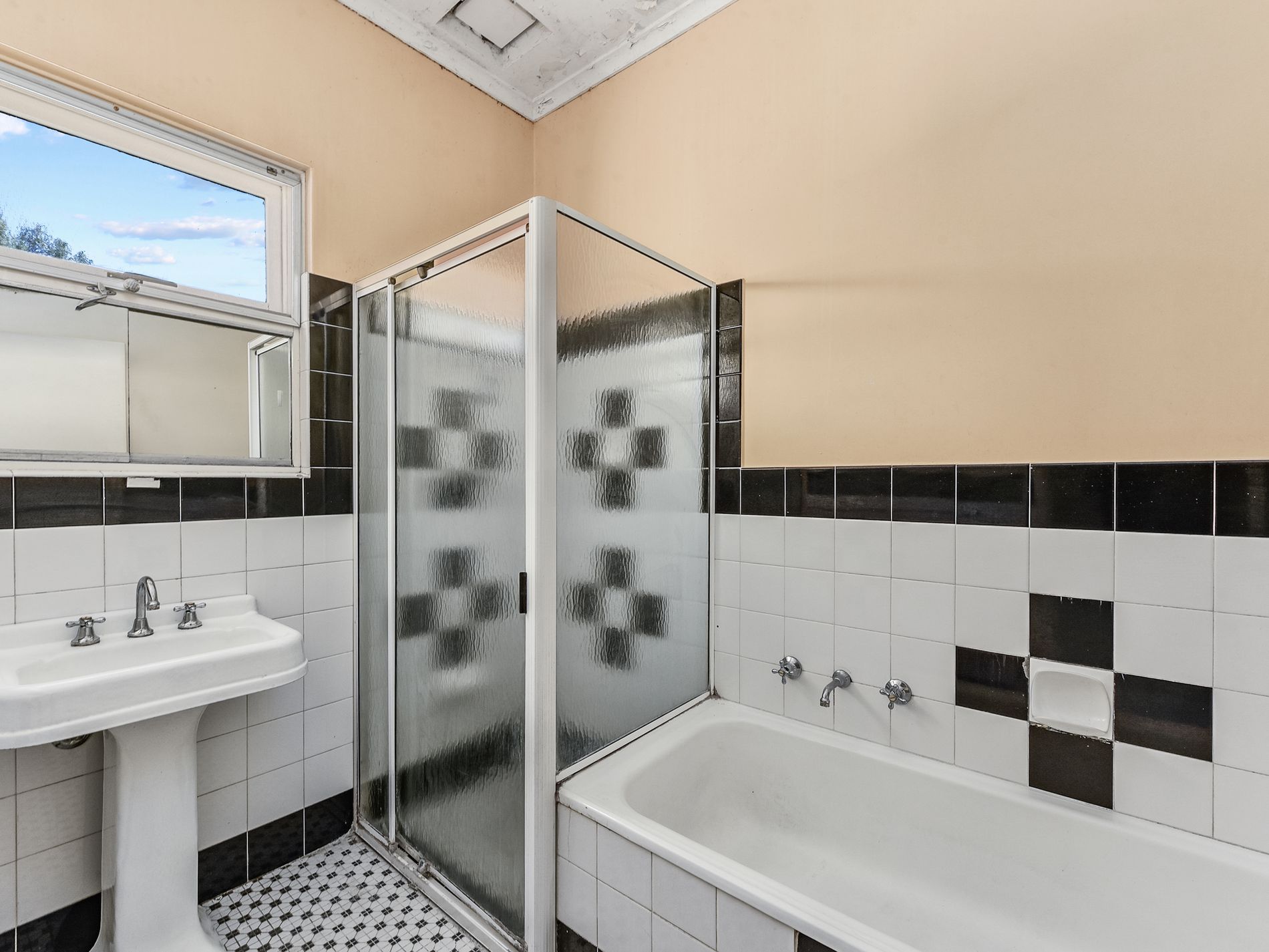 The tiled bathroom, situated between the bedrooms, features a vanity, shower and bath. A separate toilet and large laundry with rear access are positioned adjacent.