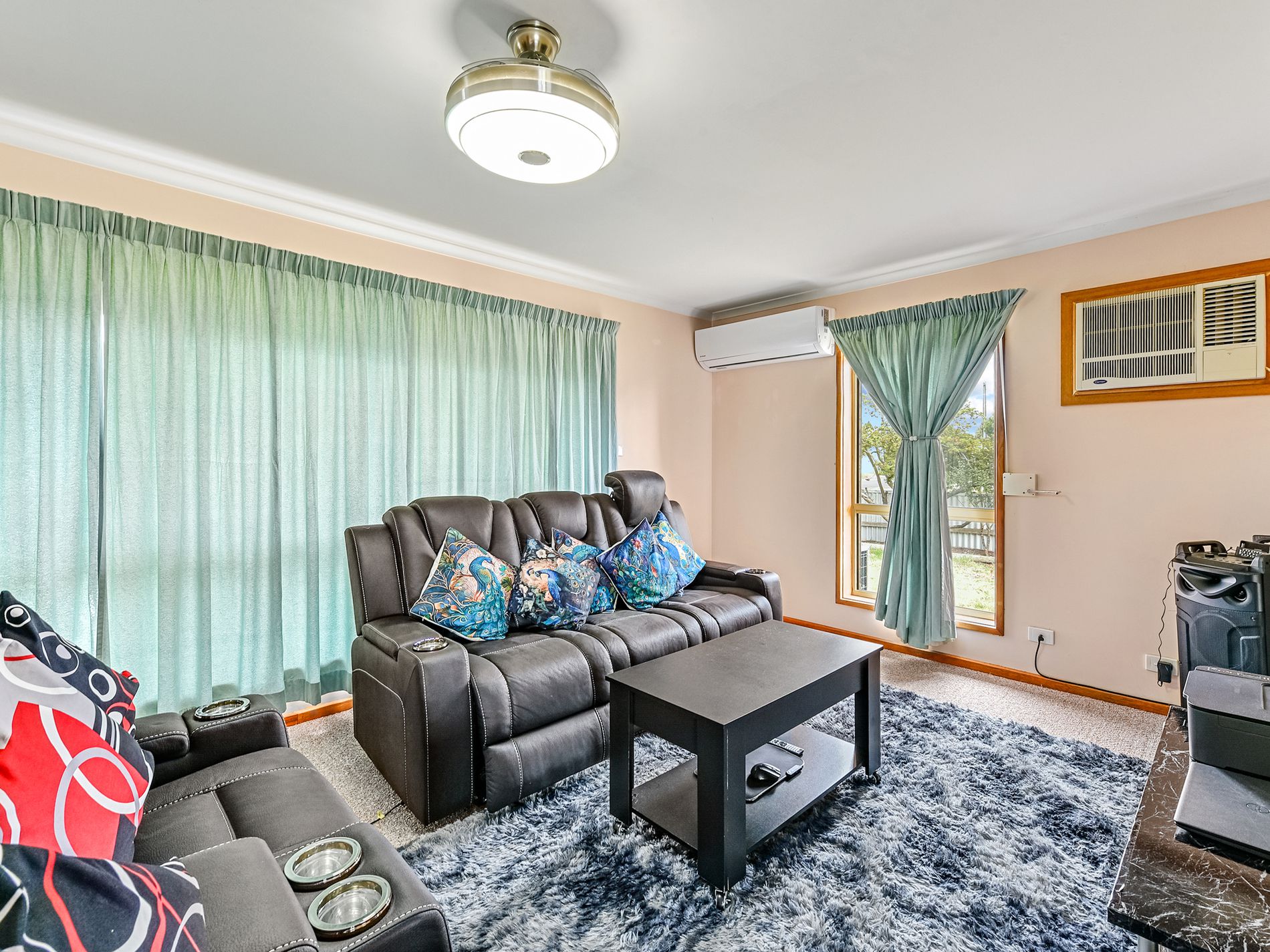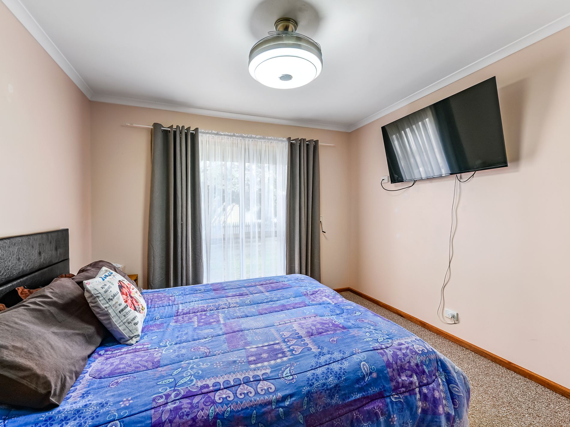 The open-plan living space comprises the kitchen, dining, and meal areas, creating a warm and inviting atmosphere. The carpeted lounge has curtains and is equipped with a reverse cycle air conditioner for comfortable heating and cooling throughout the year. A front door from the lounge leads you to a delightful private front garden that features established trees, lush lawn, and attractive hedging.