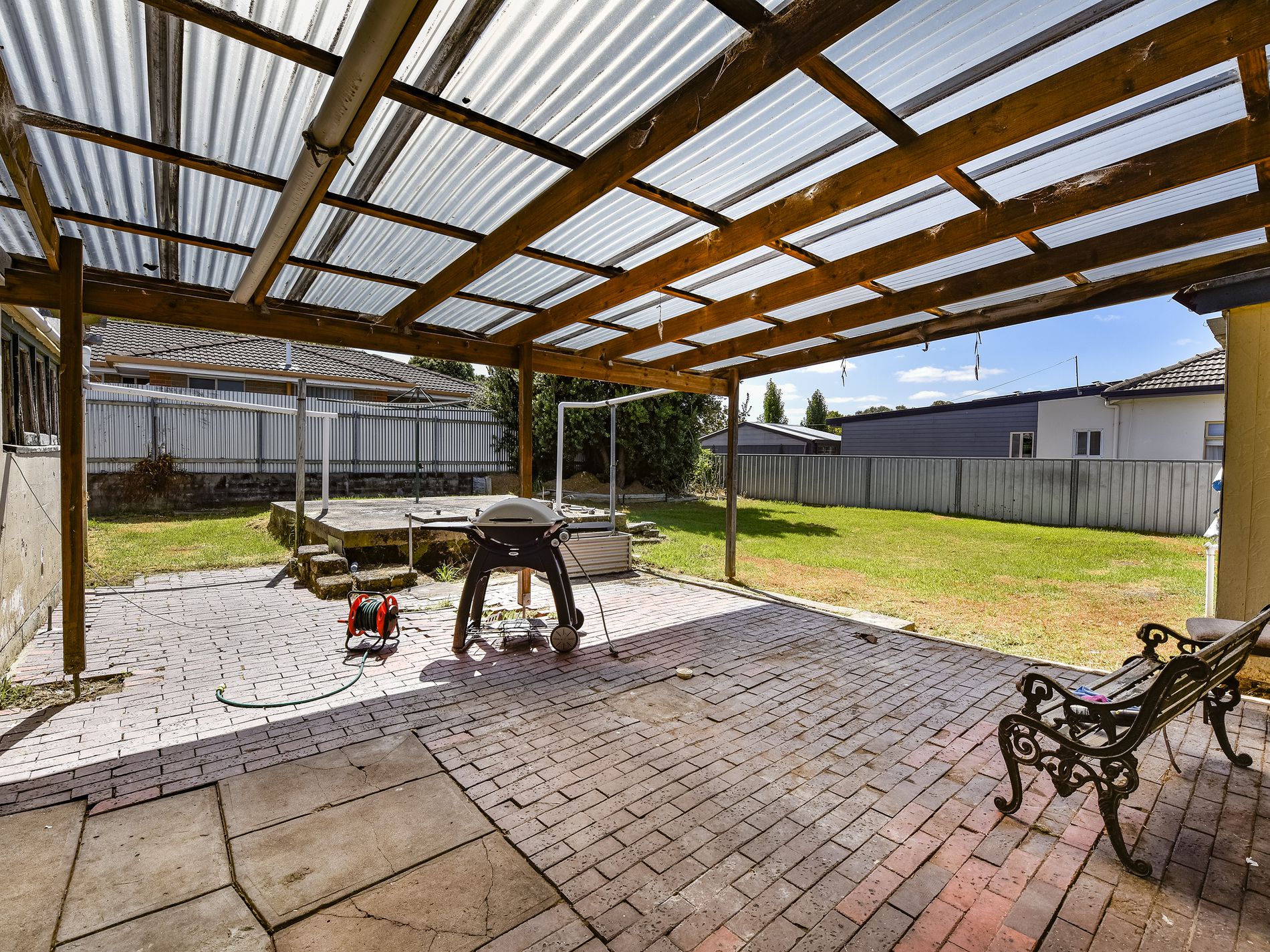 Step outside to discover the rear pergola, an ideal spot for outdoor relaxation and entertaining. The property also boasts a massive stone shed, offering secure parking for up to six cars, making it a trader’s paradise or perfect for those who require ample storage space. The private rear yard provides a tranquil sanctuary where you can unwind away from the hustle and bustle.