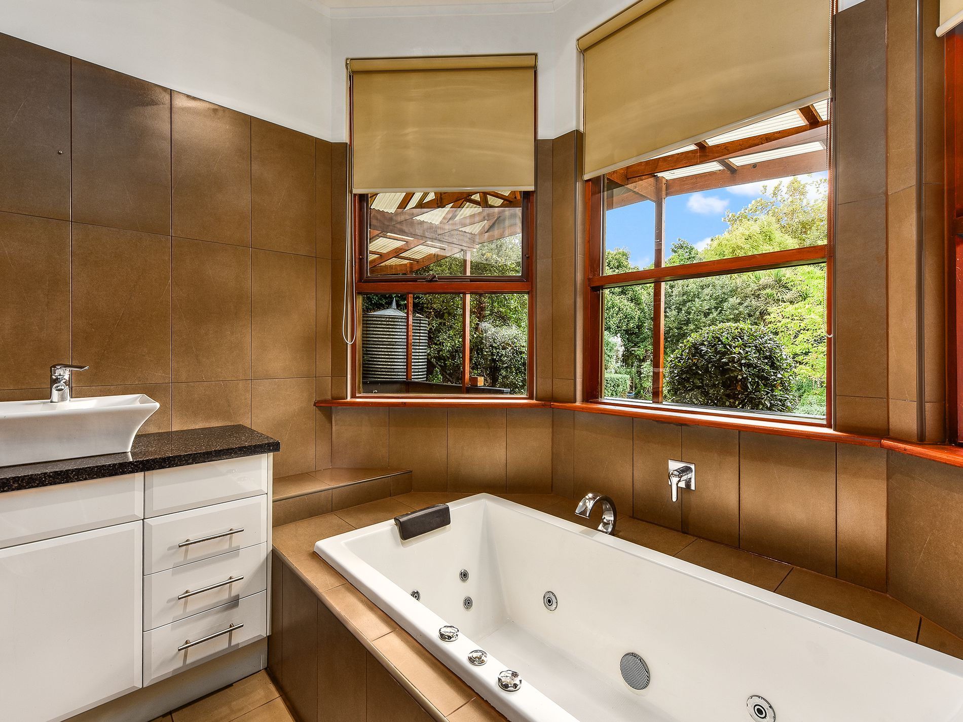 The thoughtfully modernized bathroom is a tranquil haven, featuring a luxurious spa bath, an elegant bay window framing an open shower, modern vanity, plus separate toilet and spacious laundry room.