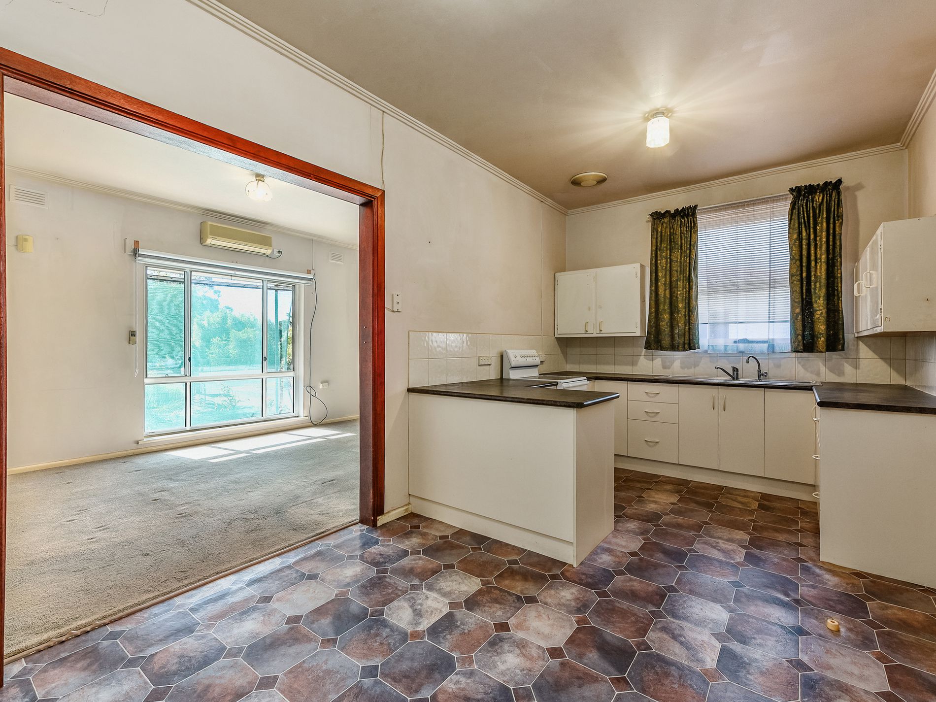 The open-plan design seamlessly connects the lounge, dining, and kitchen areas, making entertaining effortless. The kitchen features a free-standing electric oven with a cooktop, a large sink positioned under the window, and ample storage, including extended cupboard space.