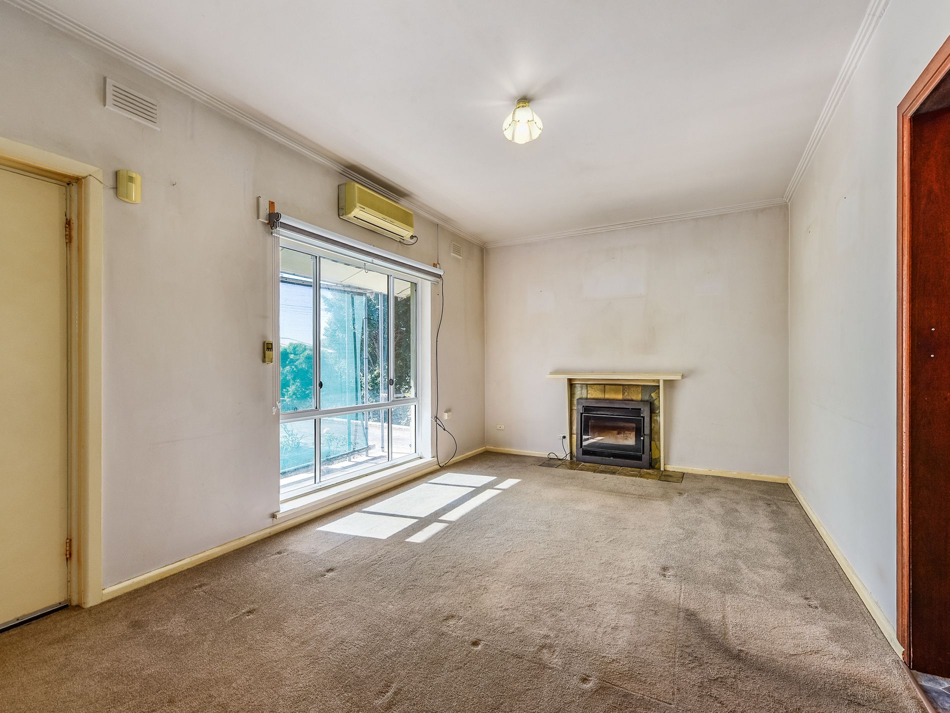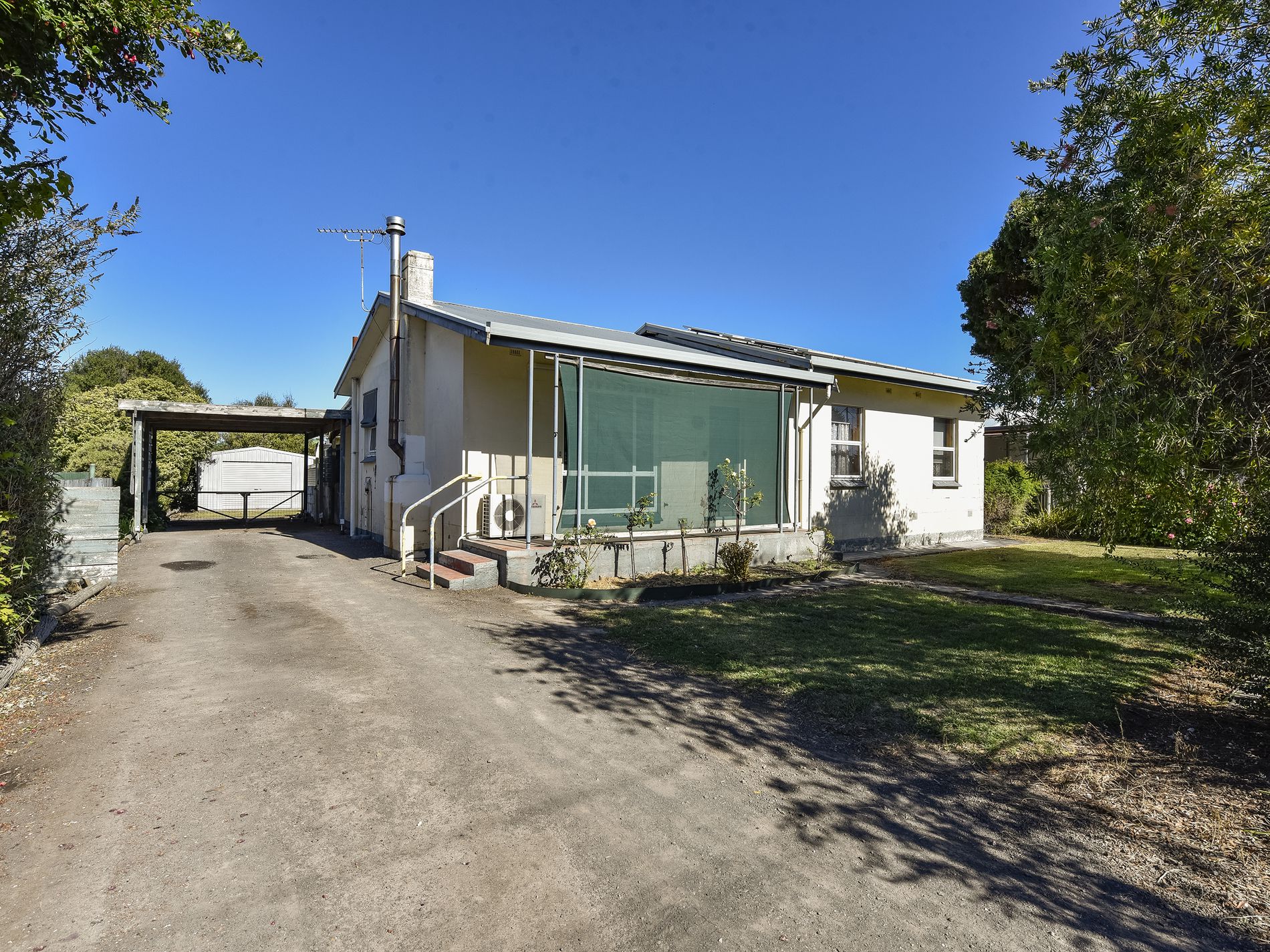 A welcoming front verandah with awnings over the front windows invites you inside. The carpeted lounge room, complete with a reverse-cycle air conditioner and a wood fire heater only two years old, creates a cozy atmosphere for year-round comfort.