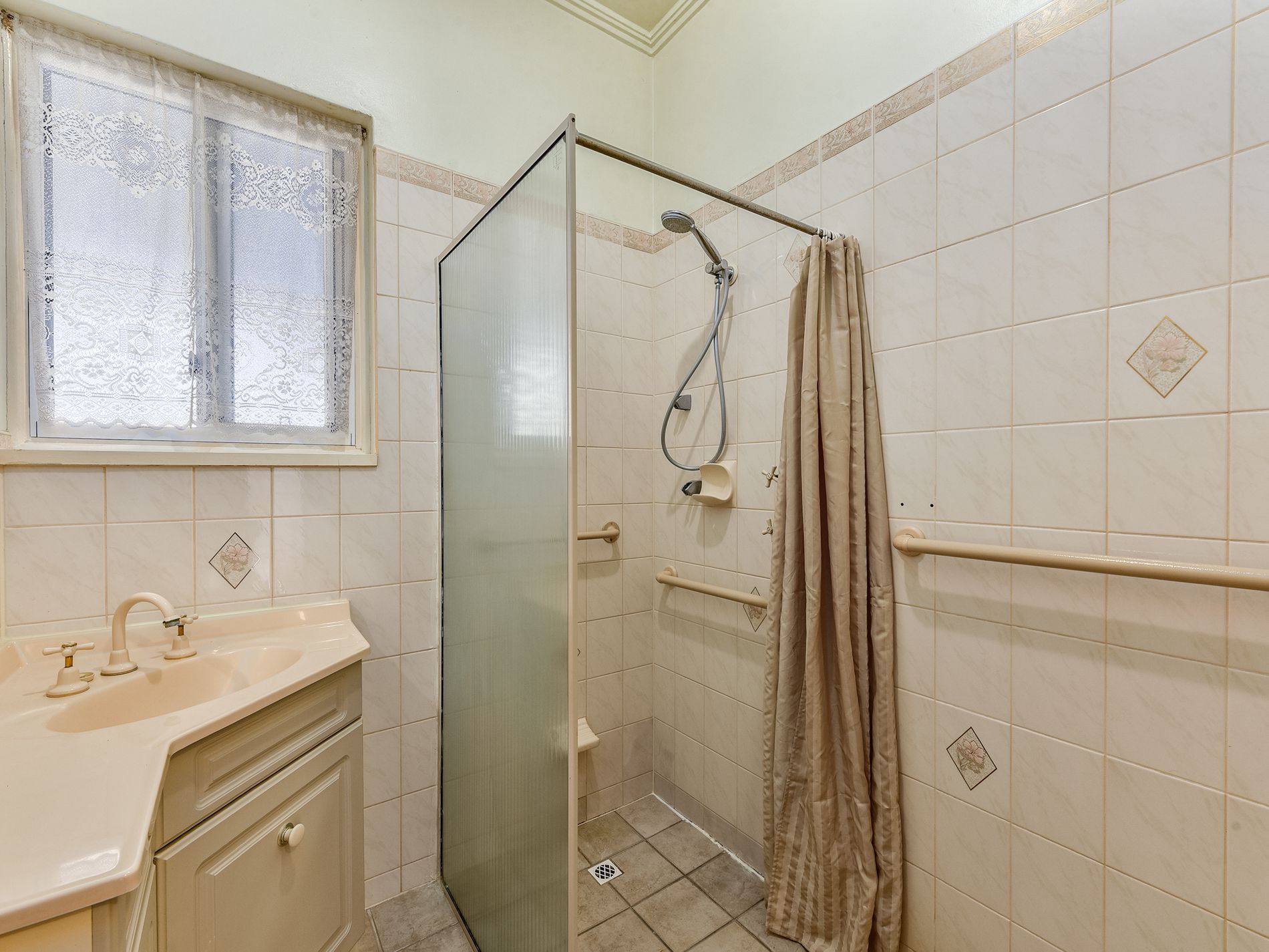 The tiled bathroom also located down the hallway, features walk in shower, vanity, and convenient grab rails.