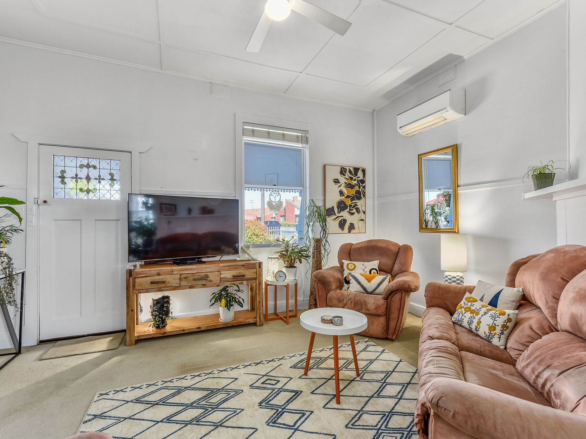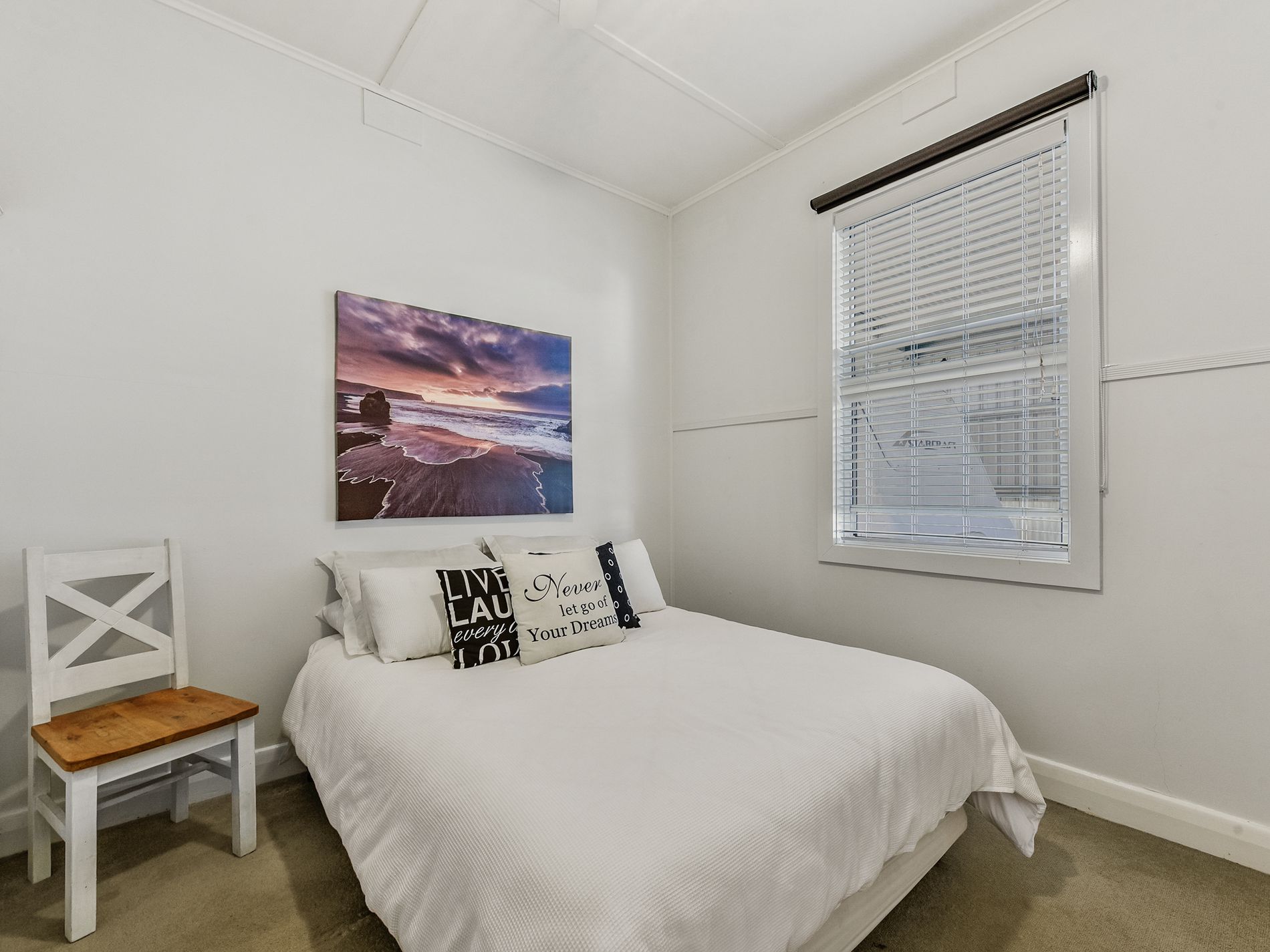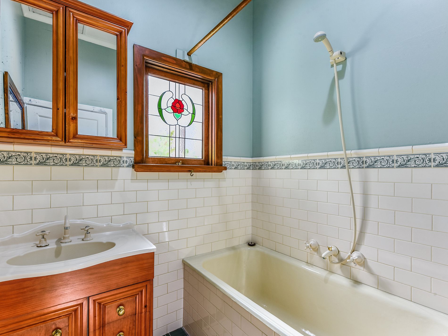 Down the hallway, you’ll find the second carpeted bedroom, also with built-in robes and a ceiling fan. The central bathroom, just steps away, includes a vanity, shower-over-bath, and a charming original leadlight window that adds a touch of character.