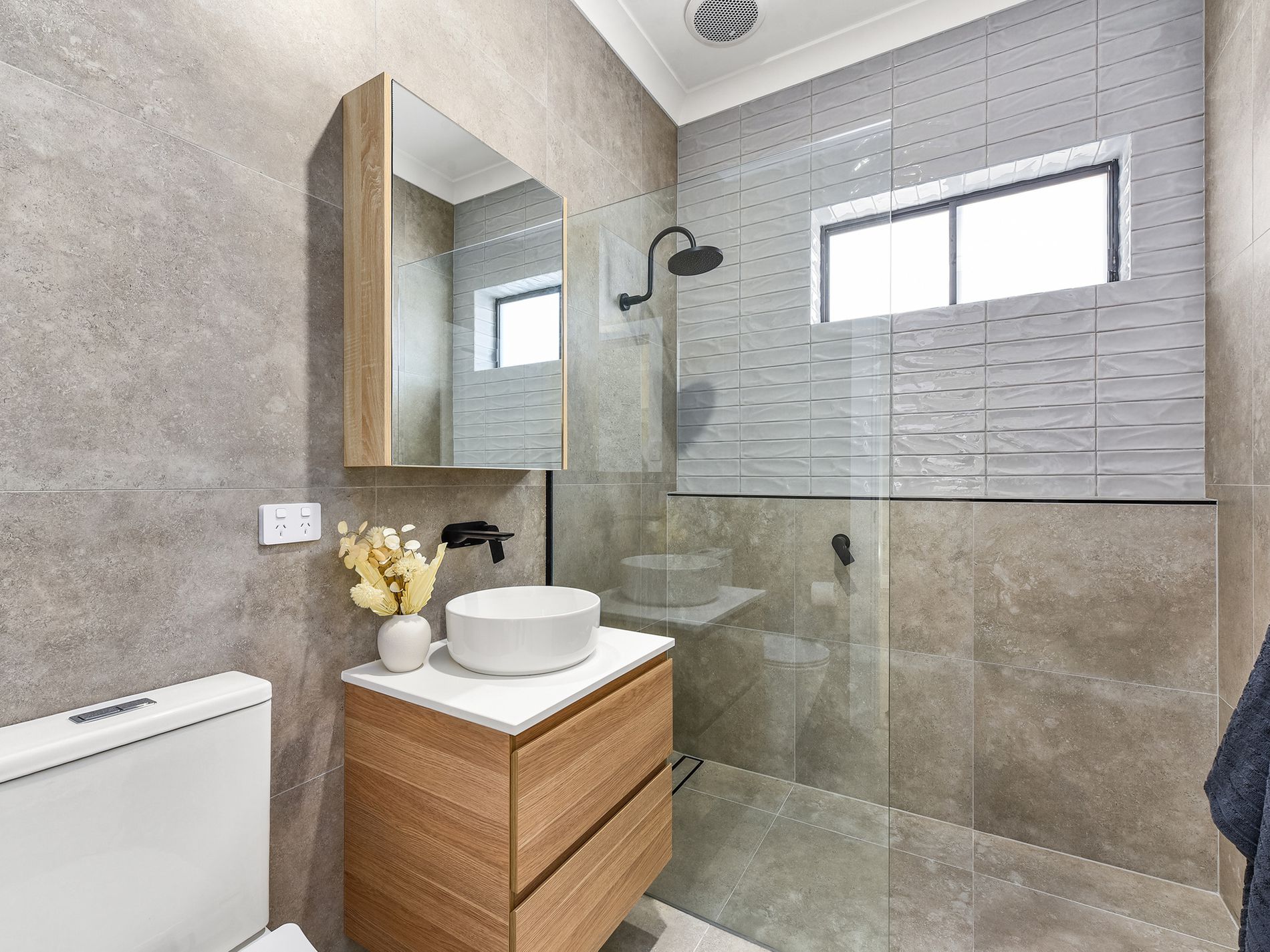 The bathroom is like something out of a magazine – thoughtfully designed with a shower, vanity, and toilet, offering both function and flair.