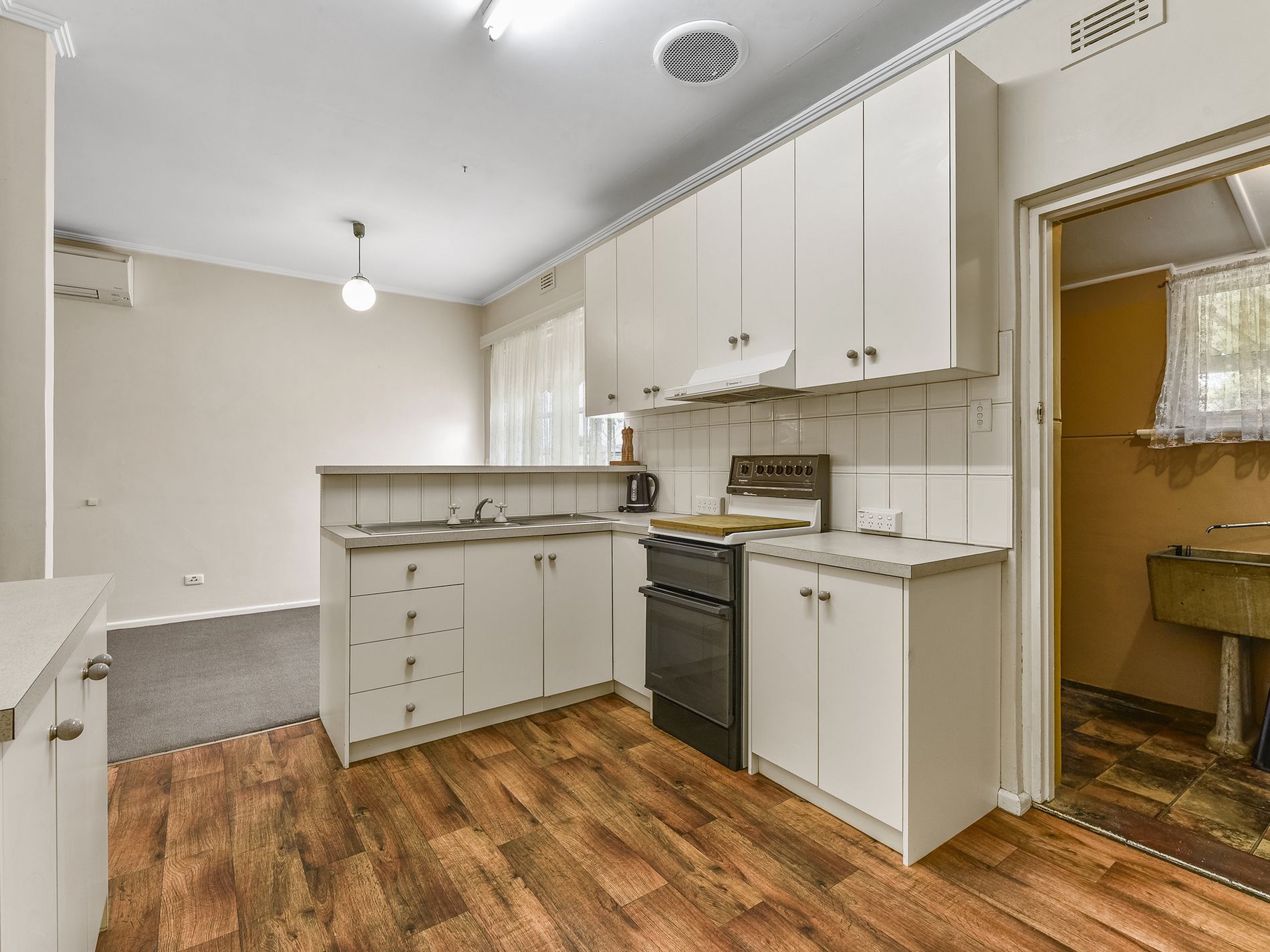 The functional kitchen has wood-look vinyl flooring, electric cooking, and a range hood. There are plenty of cupboards for storage and a single sink behind an elevated splashback with top shelf for clean up and to hide the kitchen messes. A door from here leads to the laundry, separate toilet and rear sunroom.