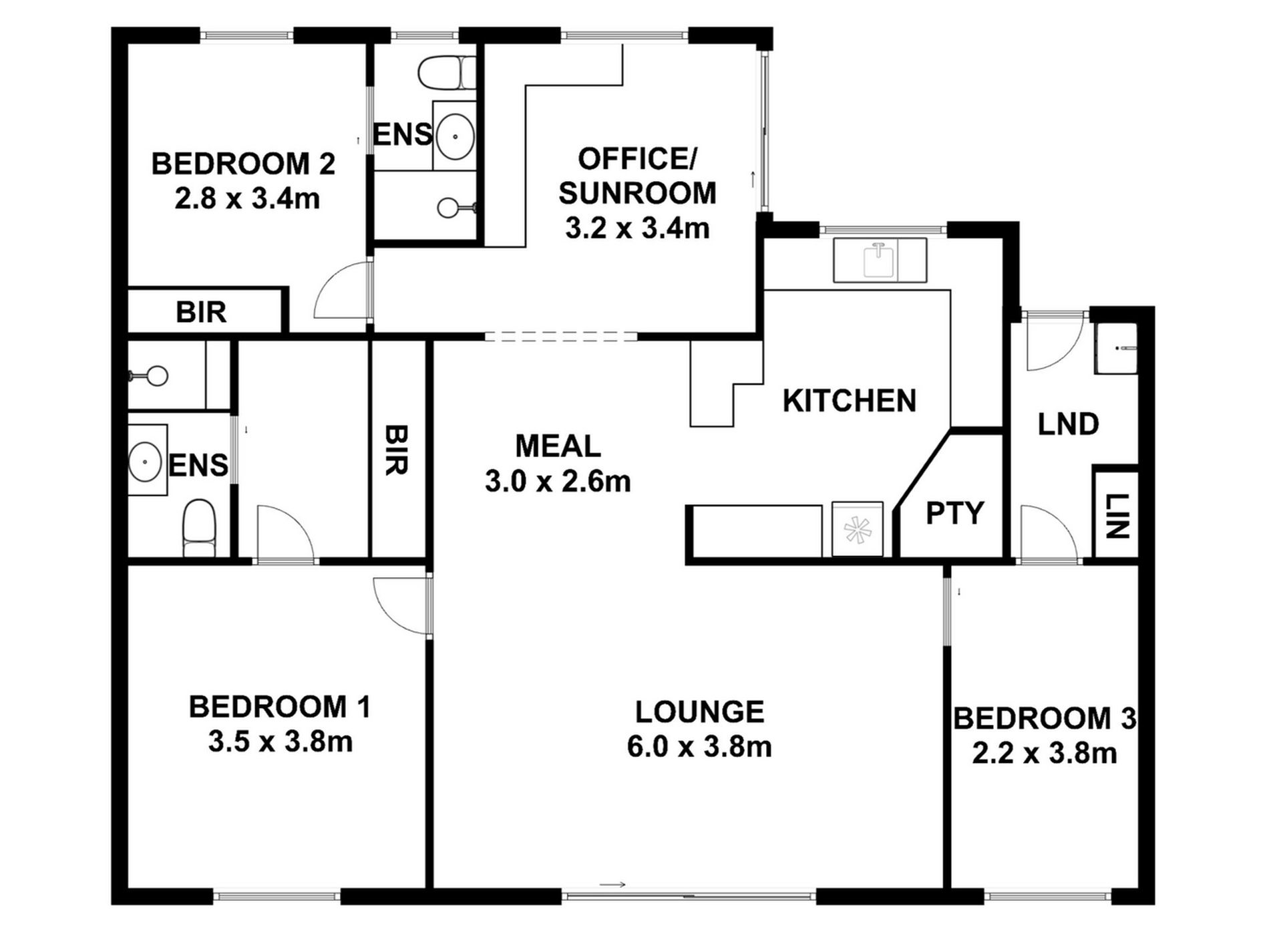 The home offers three bedrooms, thoughtfully positioned for both privacy and versatility. Bedrooms one and two are generous in size, each featuring built-in robes and private ensuites — an ideal arrangement for families, guests, or those seeking extra convenience. The third bedroom is located just off the living area and near the tiled laundry, offering flexibility as a bedroom, nursery, or additional hobby space.