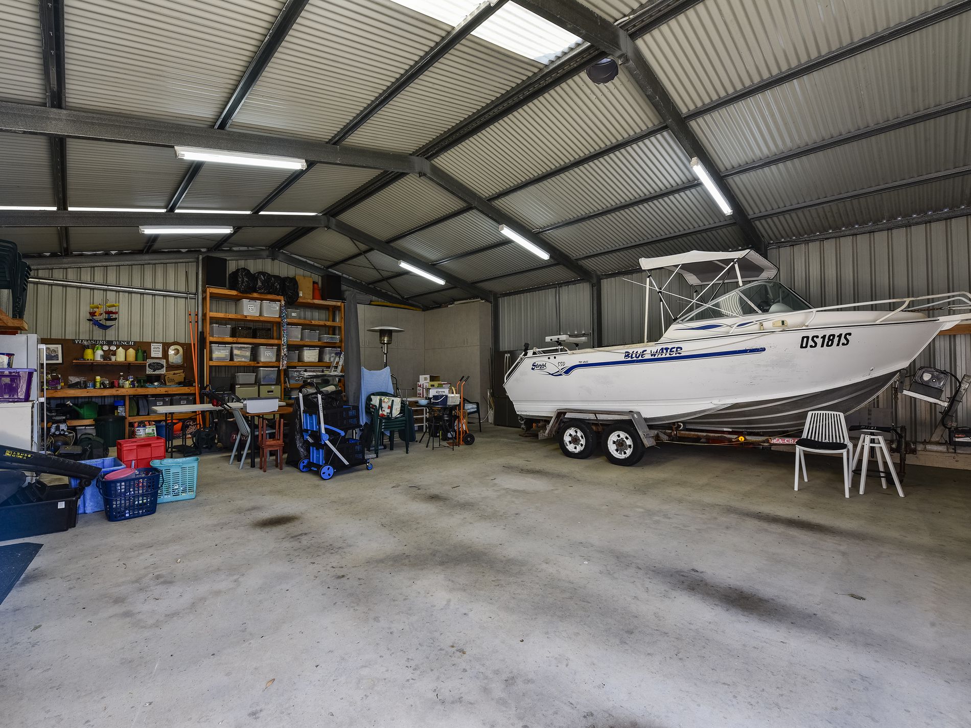 Stepping outside, the property continues to impress with a well-maintained rear yard, wide paved driveway, and a substantial three-bay shed (12m x 9m) featuring high-clearance 2.9m roller doors, perfect for securely storing boats, caravans, trailers, or setting up a workshop. At the rear of the shed, you’ll find a dedicated sink, offering a place to gut and fillet your catch after a big day on the water, keeping the mess out of the house and shed. An additional sheltered outdoor area provides a fantastic space for relaxed gatherings with family and friends. A convenient barbeque shed/man cave situated off the outdoor area offers the perfect place to cook the days catch.