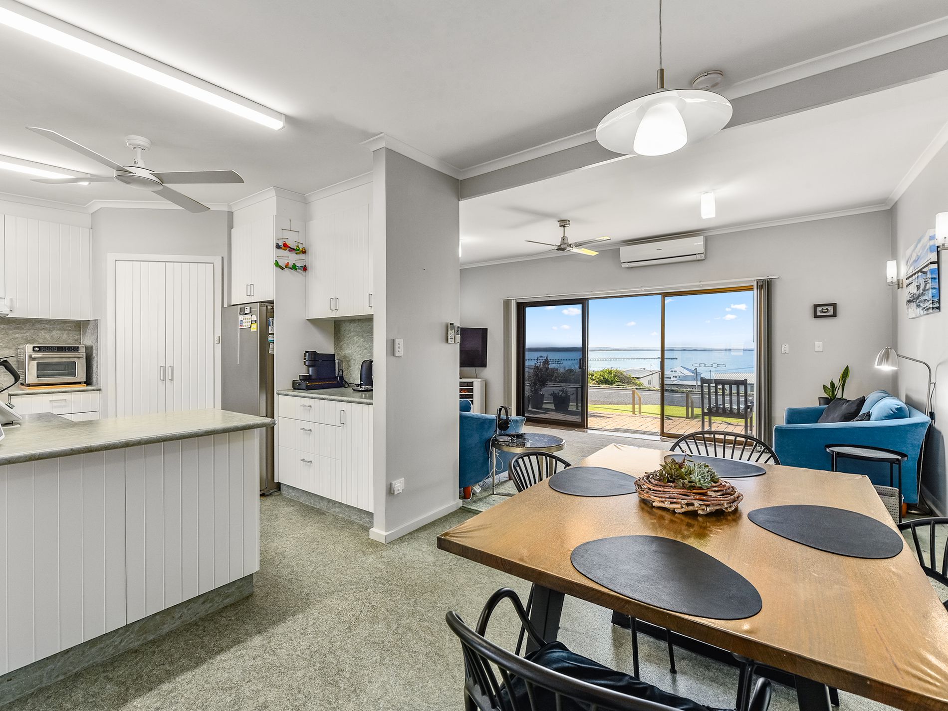 Upon entering, you’re immediately welcomed into the generous open-plan lounge, where large glass sliding doors open onto the front decking area. This seamless indoor-outdoor connection creates the perfect setting for entertaining or simply unwinding as you soak in the stunning panoramic views across the bay. The lounge is a bright, comfortable space to gather with family, enjoy a quiet evening, or watch the sun rise over the water. A reverse cycle air conditioner and ceiling fan ensure year-round comfort in this beautiful living area.