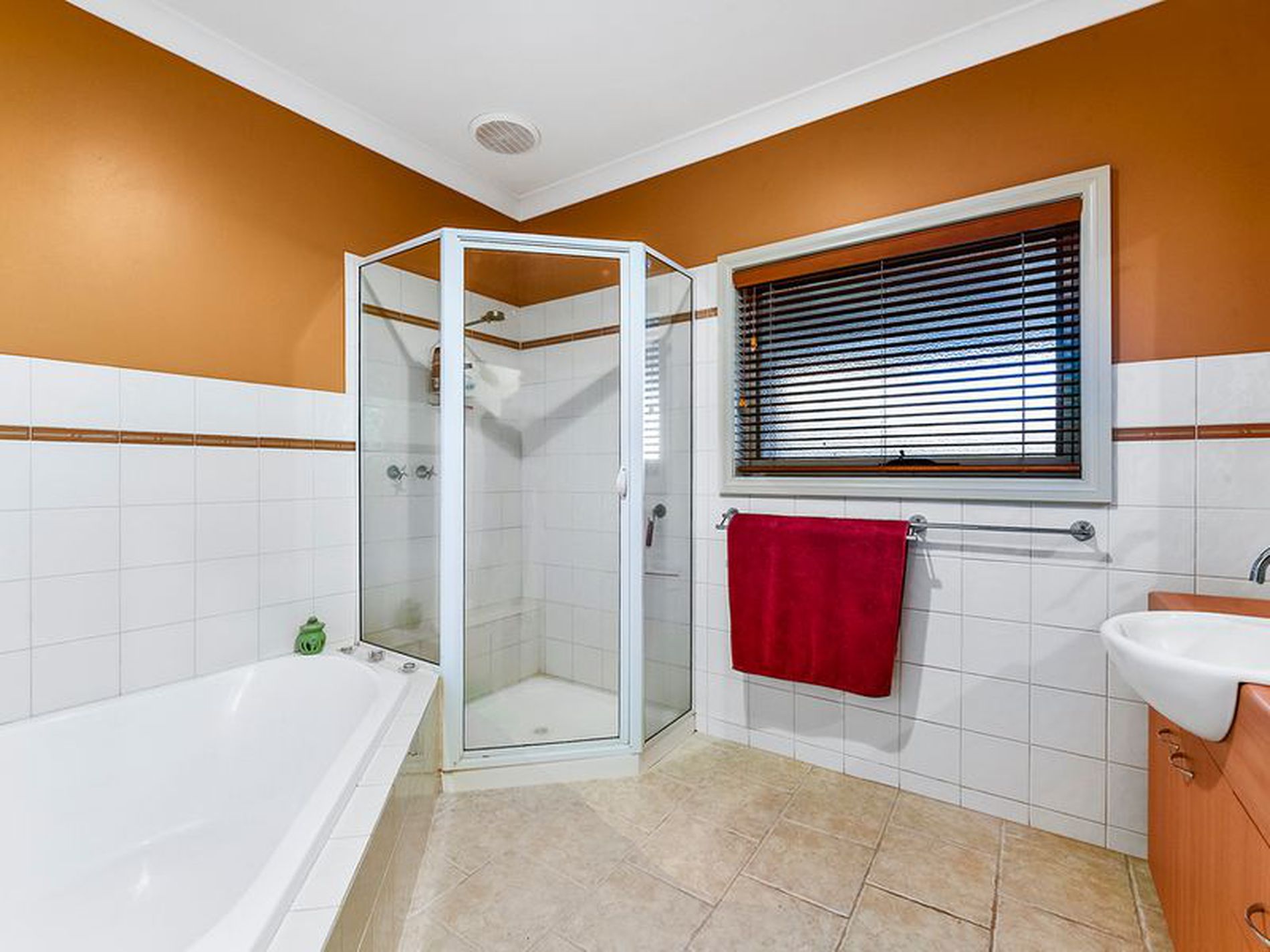 The main bathroom has white tiles and neutral tones, there is a corner bath, large shower & vanity. The toilet is separate.