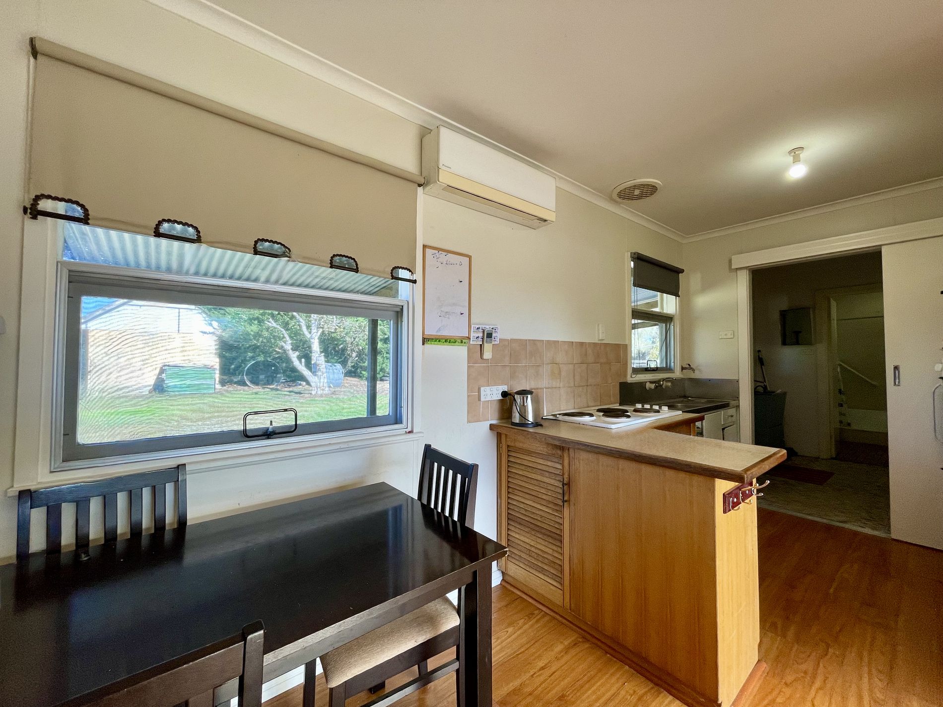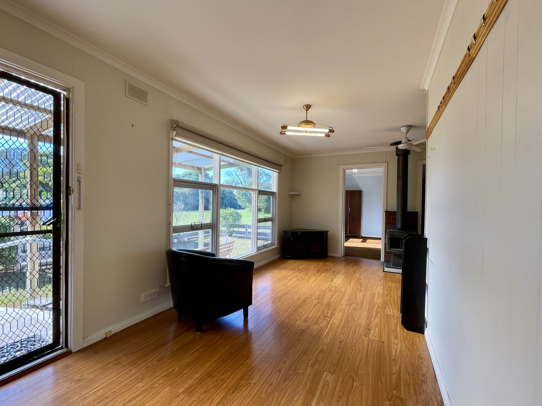 Central living area with slow combustion wood fire and reverse cycle air conditioning.