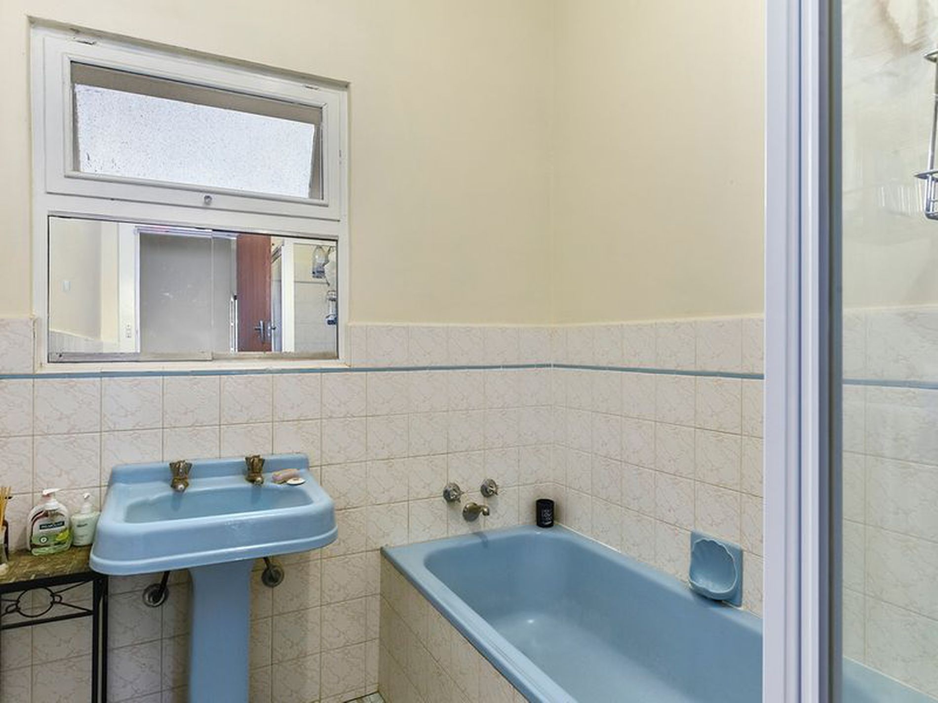 The bathroom is original but in good condition with a separate bath, shower with screen and vanity.
