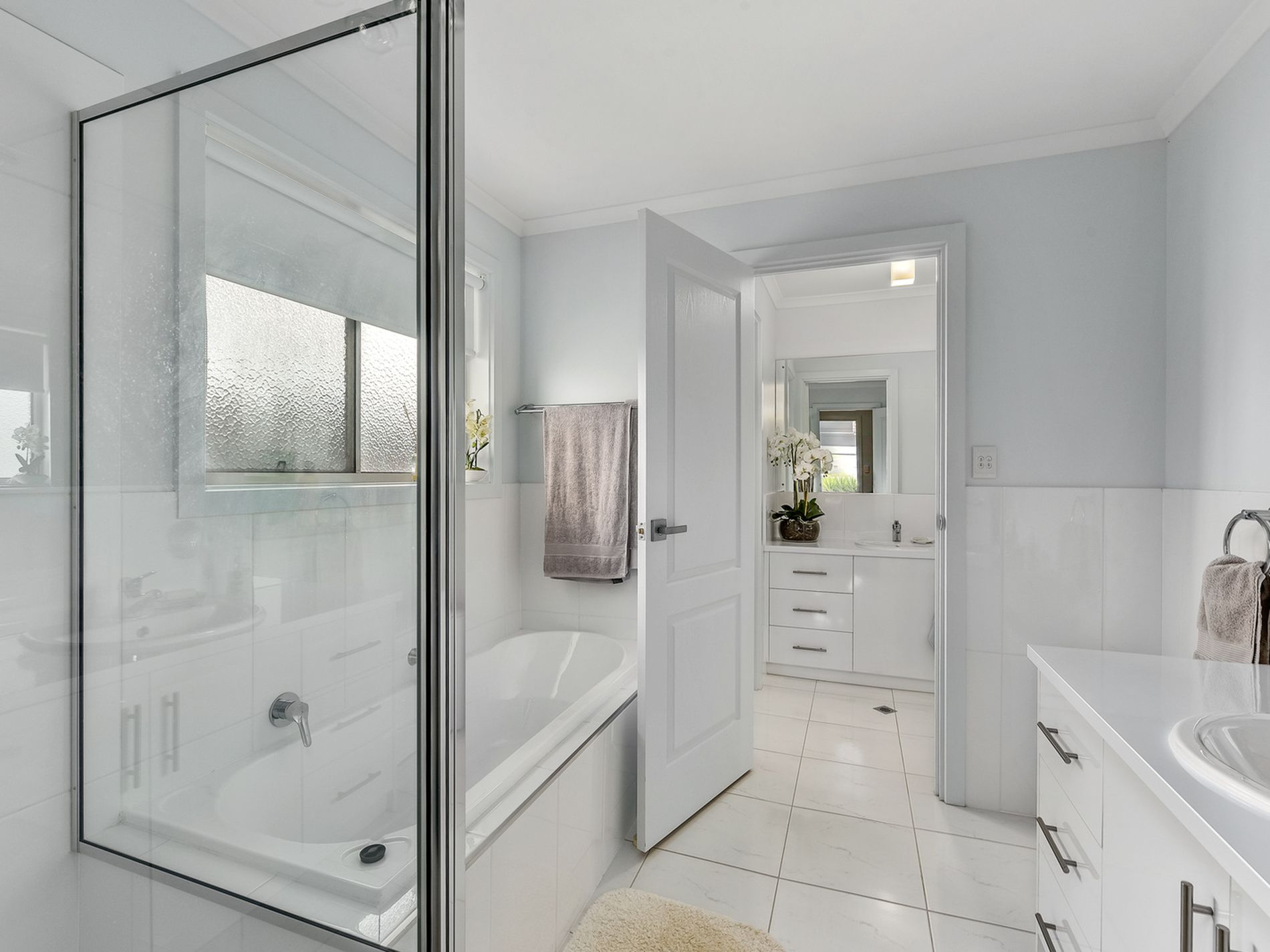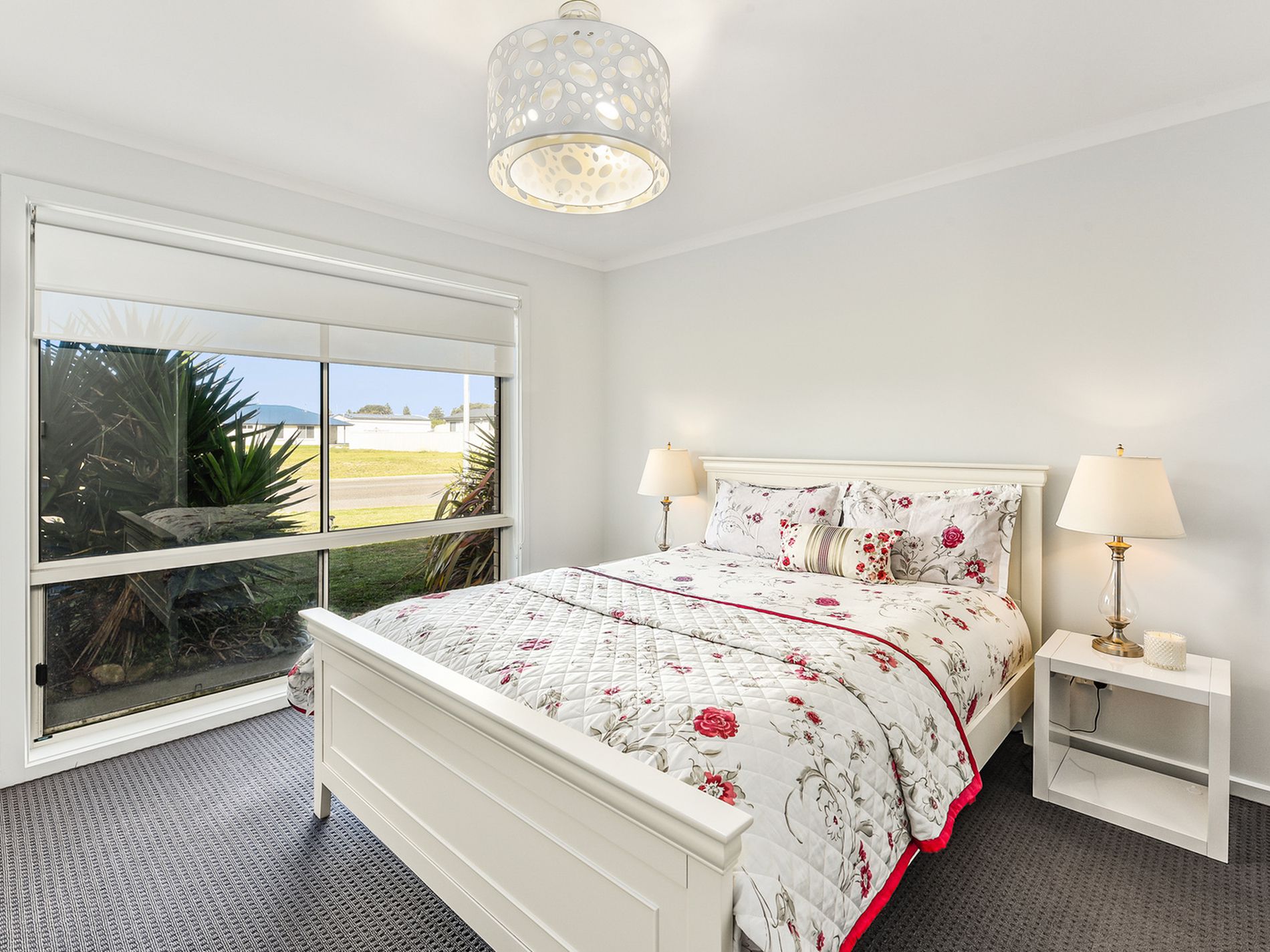 Large carpeted master bedroom is at the front of the home with a generous walk through robe leading to the master bathroom with separate powder room.
