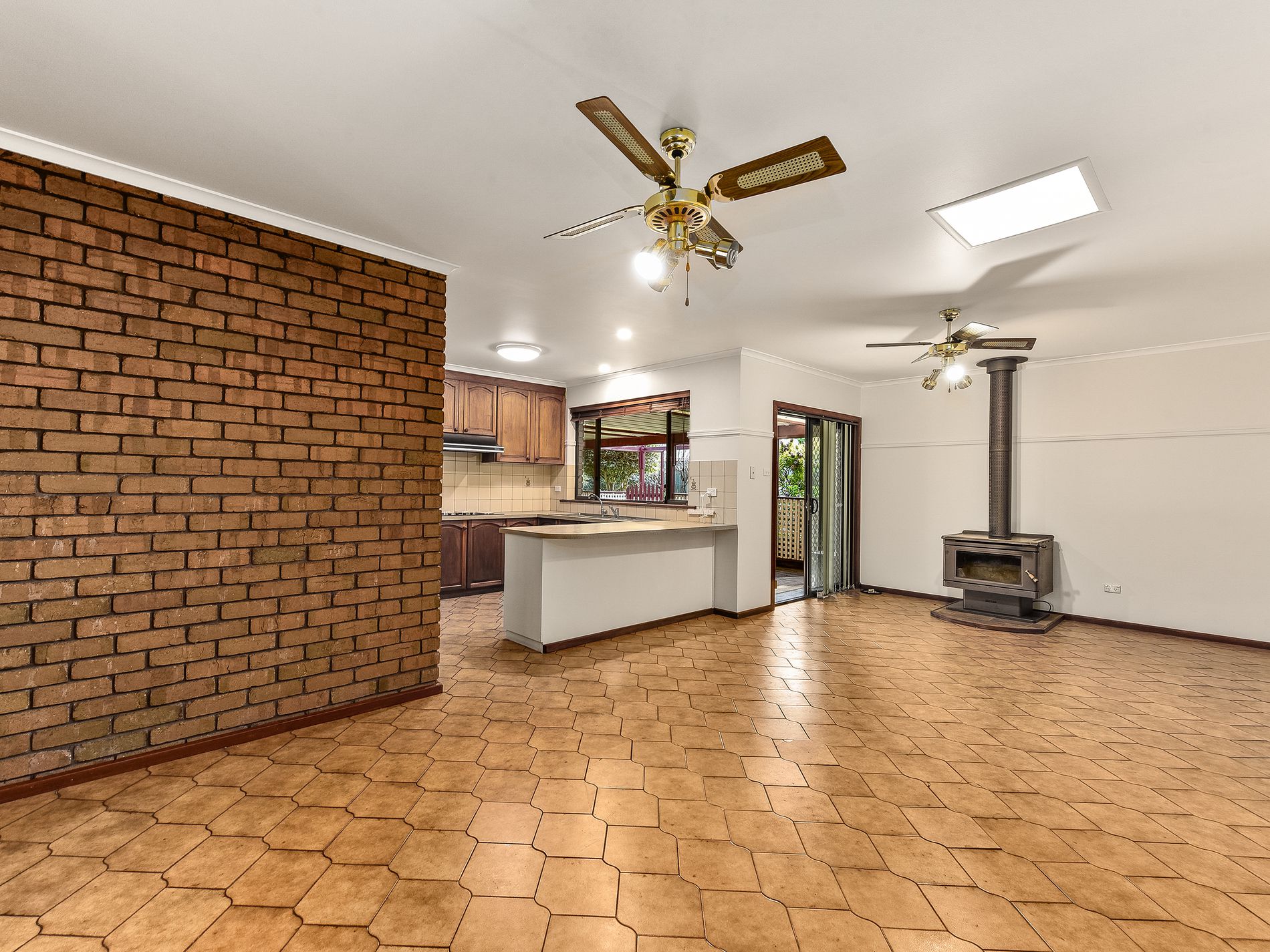 Upon entering through the front door, you're welcomed into a hallway that leads to the heart of the home. To the left, discover a large formal lounge with expansive windows, including a charming bay window that fills the space with natural light. Carpeted and spacious, it seamlessly connects to the formal dining or extended living area. From here, you step into the massive open-plan kitchen, dining, and living space. The kitchen features electric cooking, a rangehood, dishwasher, and ample cabinetry for storage. Tiled flooring continues in the casual dining and lounge area, which opens through a sliding door to a rear paved pergola—perfect for outdoor entertaining. A slow combustion wood fire in this space provides cozy warmth, while a reverse cycle air conditioner ensures year-round comfort.