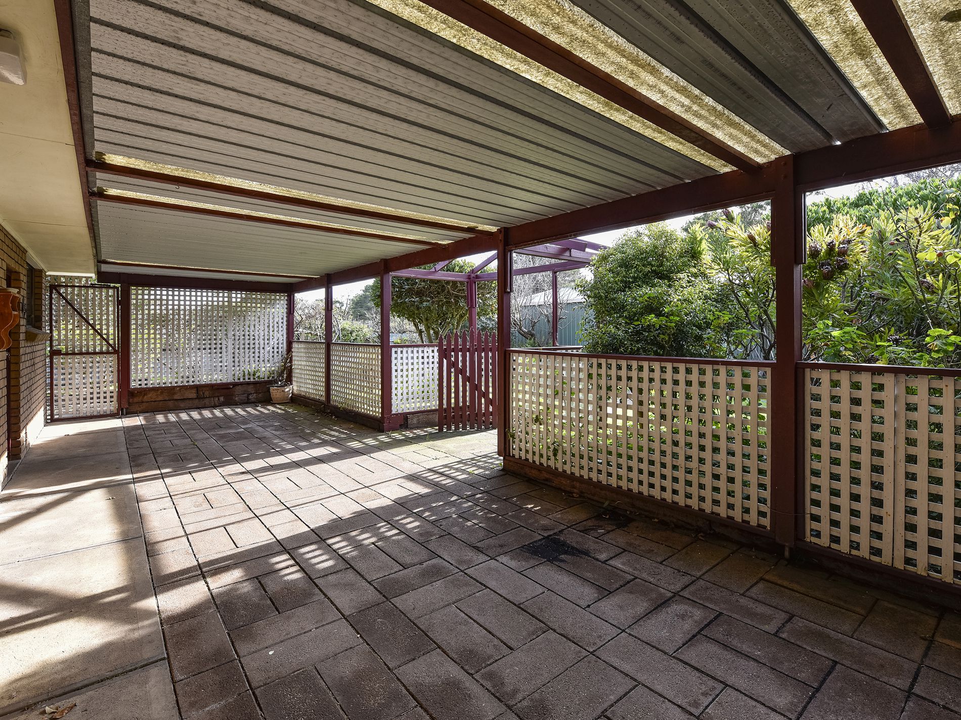 The semi-enclosed rear pergola runs the length of the house, overlooking the established gardens and backyard. It provides a shaded outdoor space ideal for relaxing or entertaining. The backyard features mature trees, colorful underplantings, and a bore supplies all your watering needs. There’s a tidy 9x6m colourbond shed with double roller doors accessed from the side road, plus rear gates leading to a carport—perfect for a caravan or boat, with flow-through access to the reserve beyond ther is plenty of spce to manouvre in and out. Additional storage includes a woodshed and a garden shed with a cement floor.
