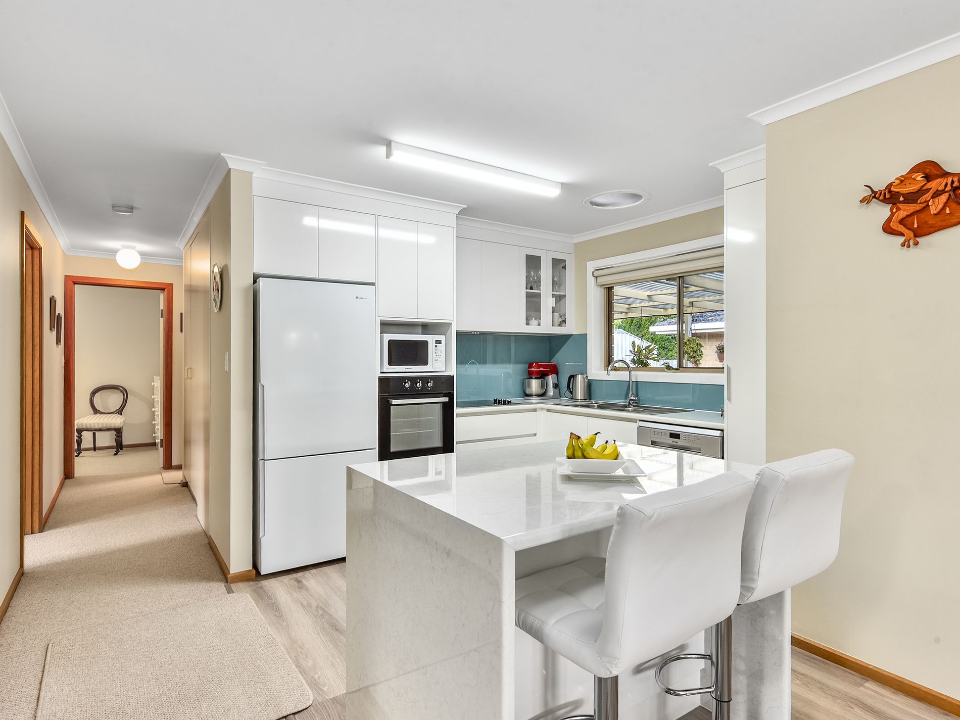 The newly renovated kitchen, installed by renowned local business Klas Bilt, features electric cooking, dishwasher, and ample cupboard space. A thoughtfully designed island bench seamlessly connects the kitchen with the living and dining areas, enhancing both function and flow.