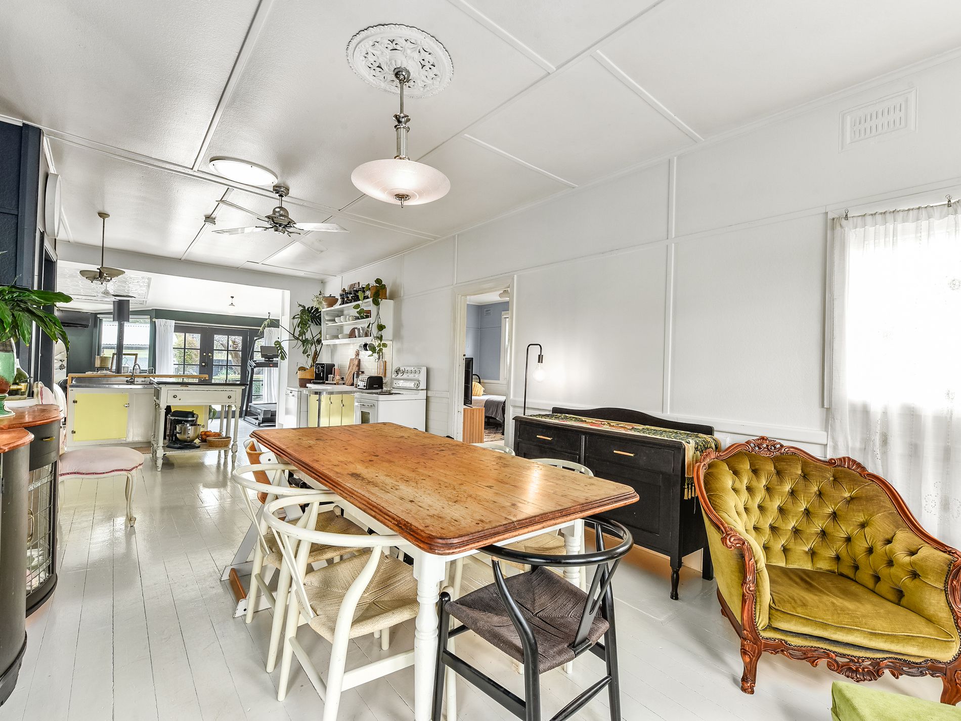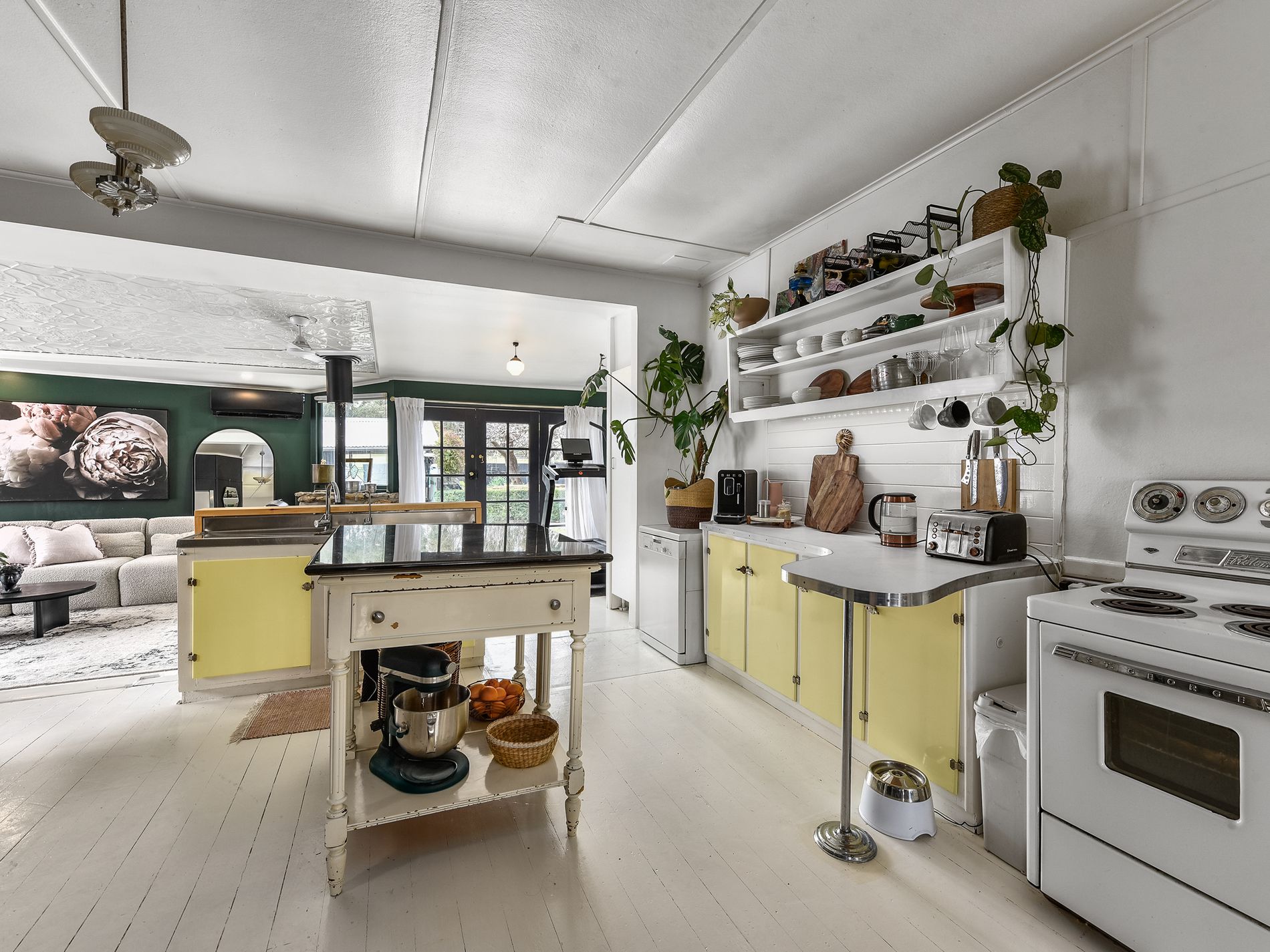 The kitchen is a true feature, with a central marble-topped island bench, retro-style cupboards, and a vintage sink that add quirky charm. A generous pantry provides ample storage, while the layout encourages easy flow and interaction. At the rear of the home, a spacious living room with painted floors continues the characterful theme, featuring pressed tin ceilings and a striking stone fire surround. Comfort year-round is assured with a slow combustion wood fire that keeps the home warm in winter, complemented by a reverse cycle air conditioner for cooling during the summer months.
