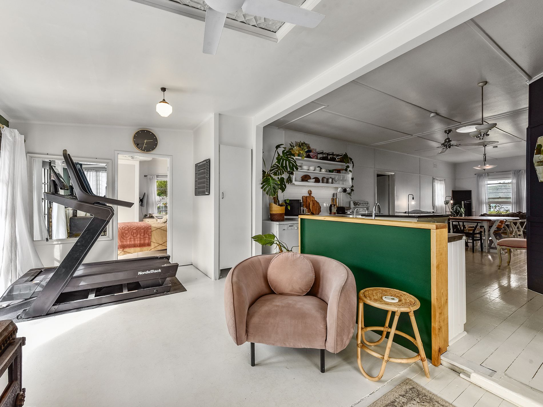 The home offers plenty of restful sleeping spaces. The master bedroom at the front features built-in storage, while the second bedroom—adjacent to the dining area—is a large, versatile space with two built-in robes that could easily be reverted back into two separate bedrooms, as it was, if desired. A third bedroom at the rear, also with built-in robes, completes the sleeping arrangements.