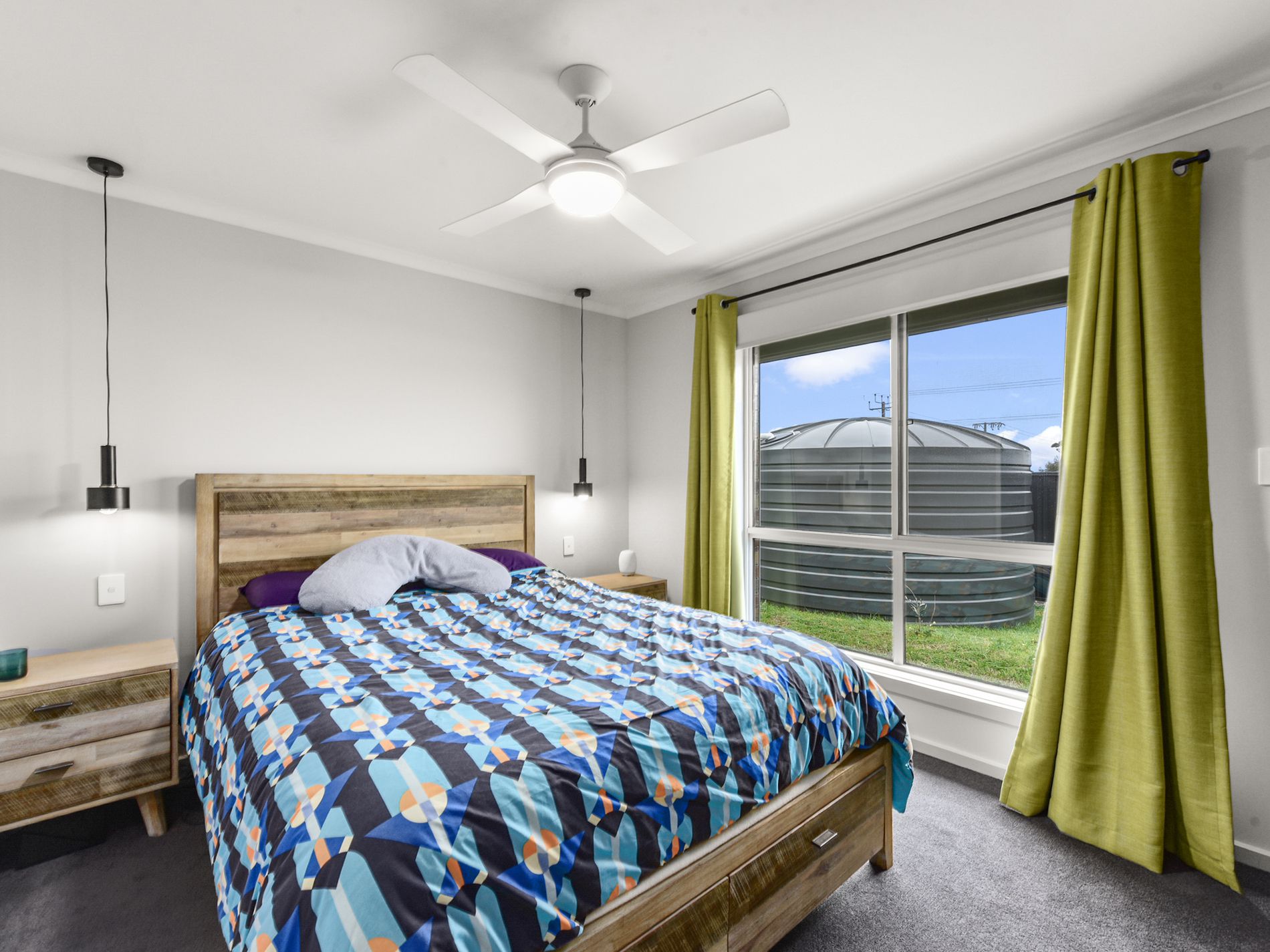 Stepping inside, you are welcomed by a spacious open plan living area that forms the heart of the home. The central kitchen is a statement in both form and function, featuring an island bench, generous pantry, electric under-bench oven, gas cooktop, and dishwasher. Designed for effortless entertaining, this space flows seamlessly to the rear alfresco area, complete with zip track blinds for year-round enjoyment.