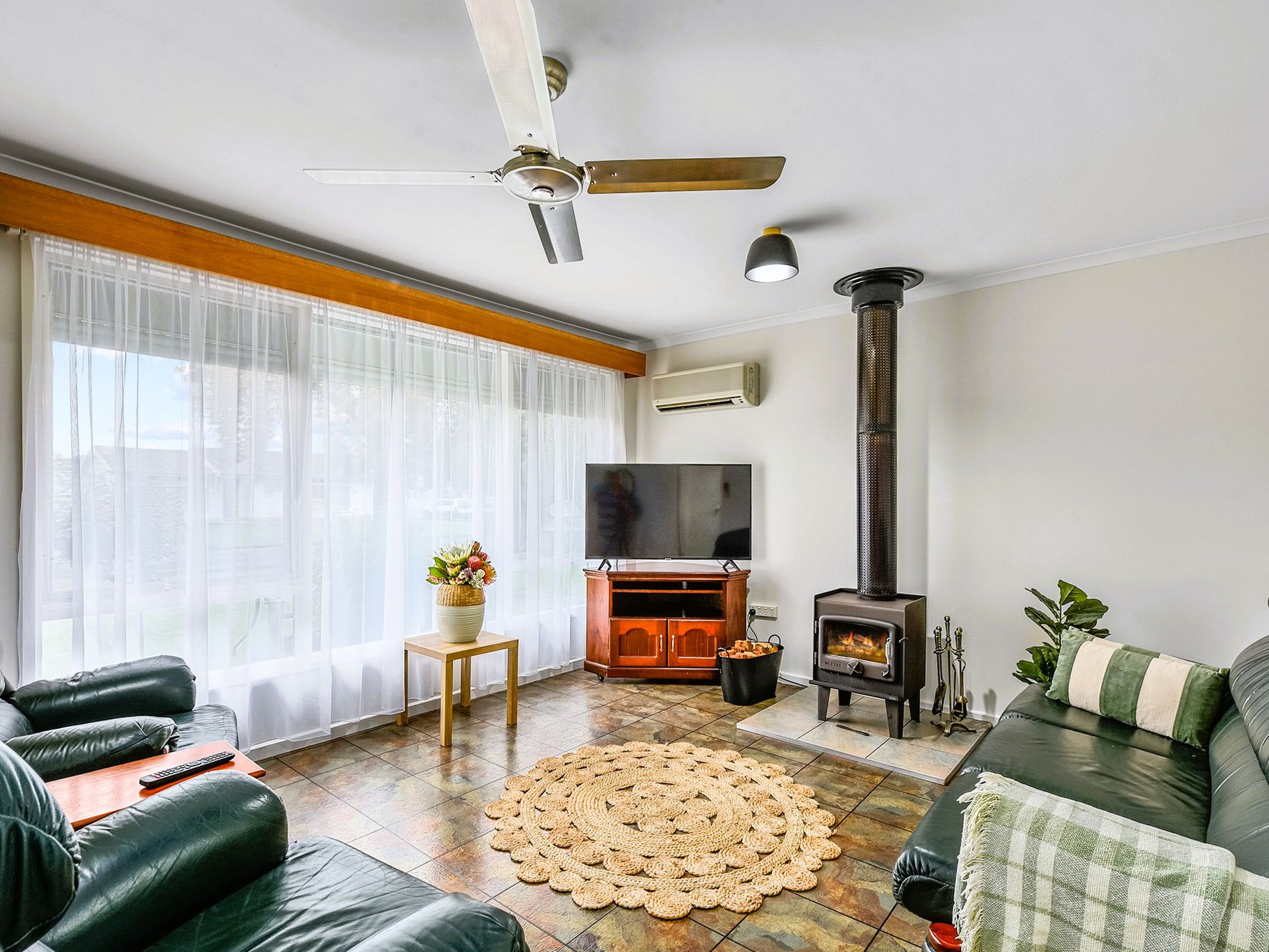 Freshly updated with new carpets, curtains, light fixtures, and a fresh coat of paint throughout, the home presents like new, allowing you to simply move in, unpack, and relax. Step into the lounge and you’re immediately embraced by a sense of comfort. The crackle of the fireplace creates a cosy atmosphere for winter nights, while the reverse cycle split system ensures the home is kept comfortable all year round. Flowing from here, the kitchen and dining area bring the family together with ample cupboard space, electric cooking, and an easy layout that makes both everyday living and entertaining a breeze. A mudroom connects to the outdoors, leading you directly into the heart of the home’s entertaining zone.